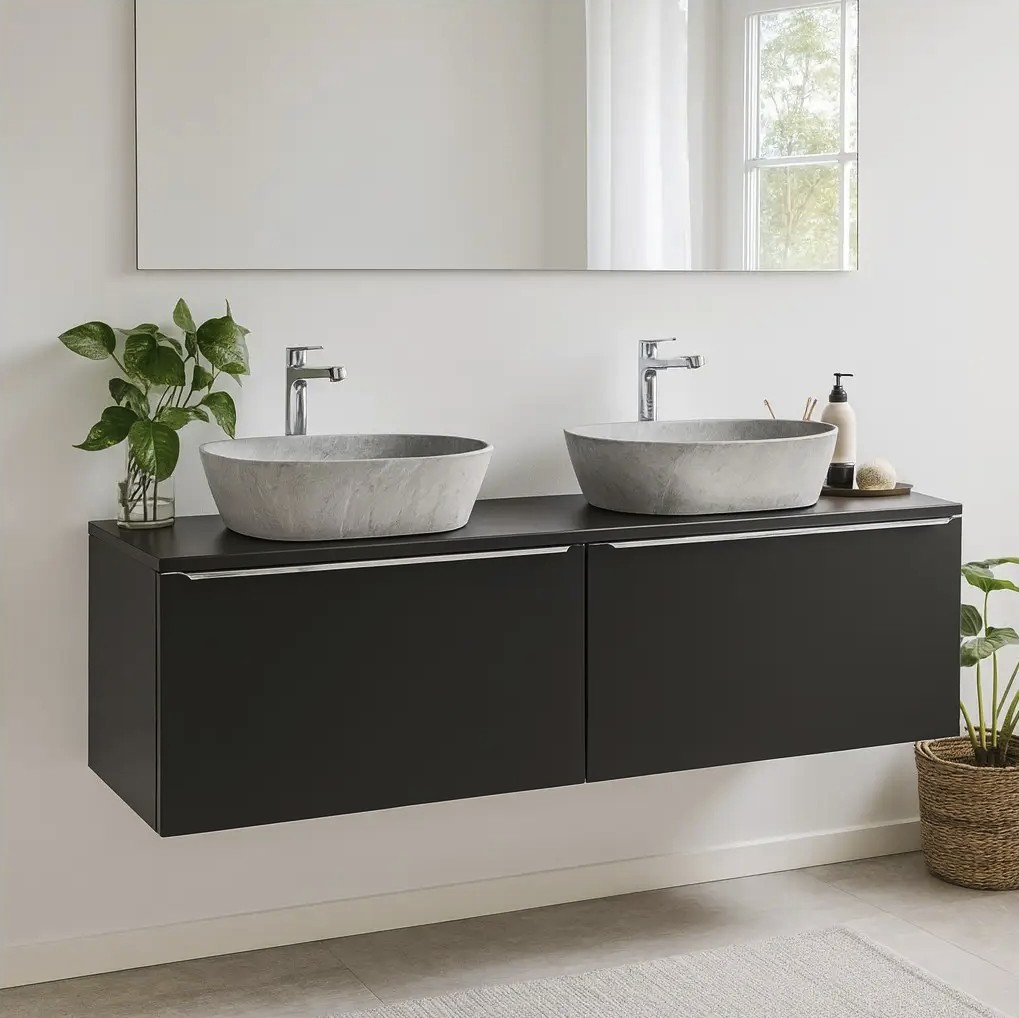 Offrez à votre salle de bain une surface élégante et minimaliste avec le plan vasque VANTA 160 cm noir. Sa finition noir mat et son design épuré s’intègrent parfaitement dans les ambiances contemporaines. Avec ses 160 cm de longueur, il permet d’accueillir aisément une double vasque ou de créer un espace de toilette très confortable.