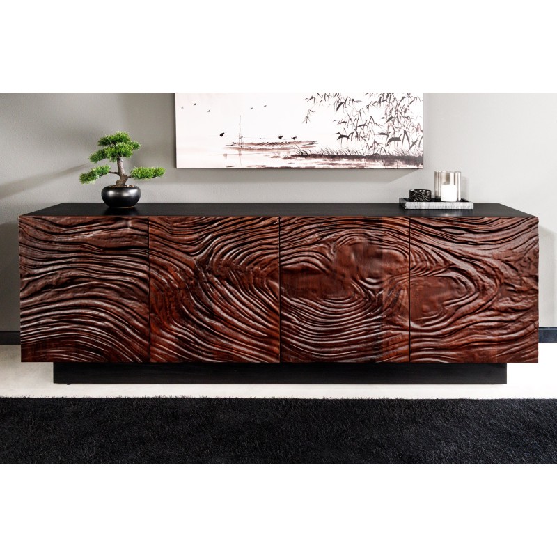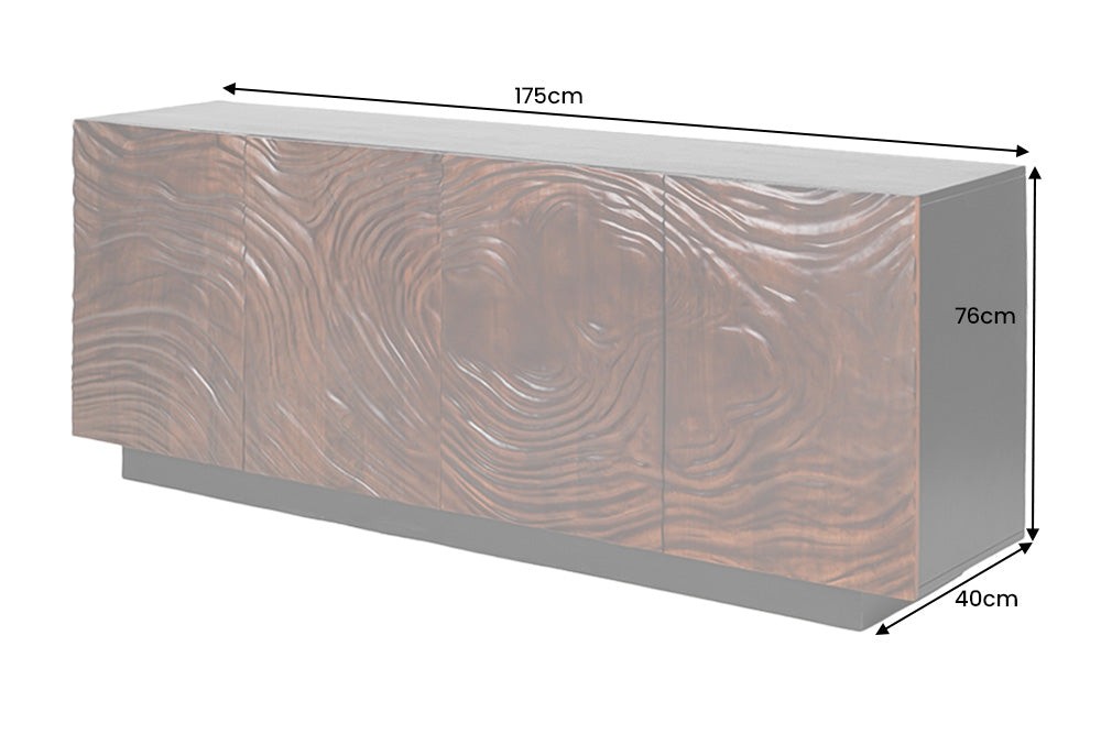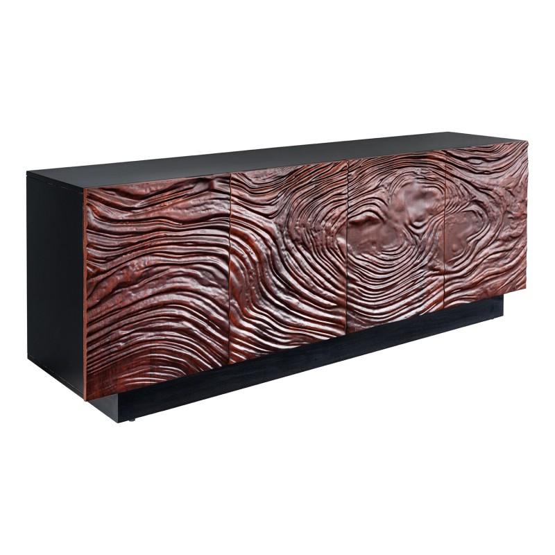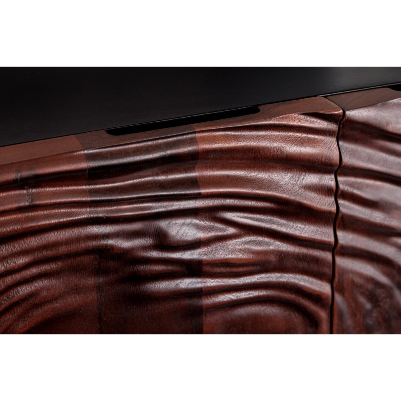 Le buffet GAÏA 175 cm est une pièce spectaculaire qui allie modernité et artisanat. Ses façades sculptées en bois massif présentent des ondulations naturelles et des striures minérales, évoquant à la fois la fluidité des formes organiques et la puissance brute de la nature. Ce meuble, à la fois sculptural et raffiné, s’impose comme un élément phare d’une décoration haut de gamme.