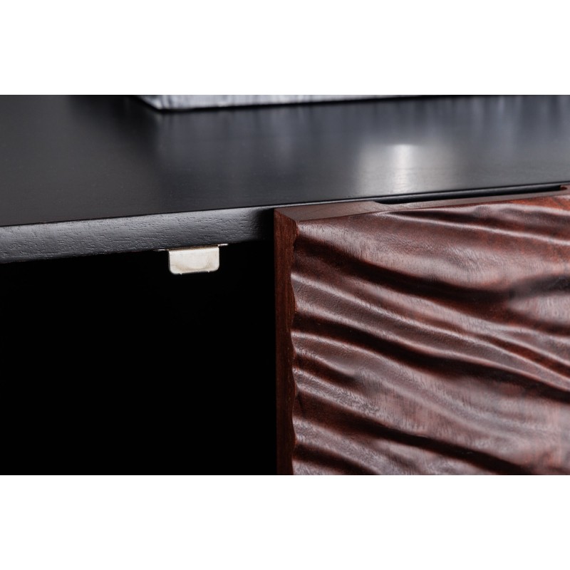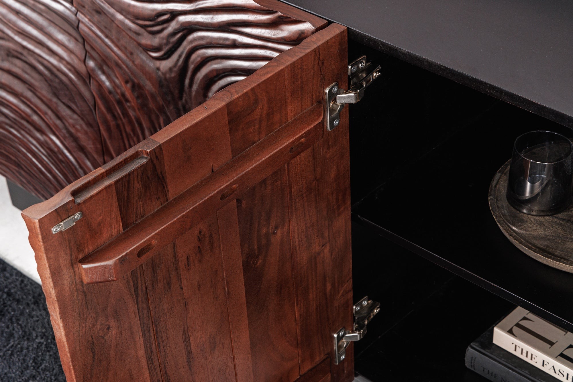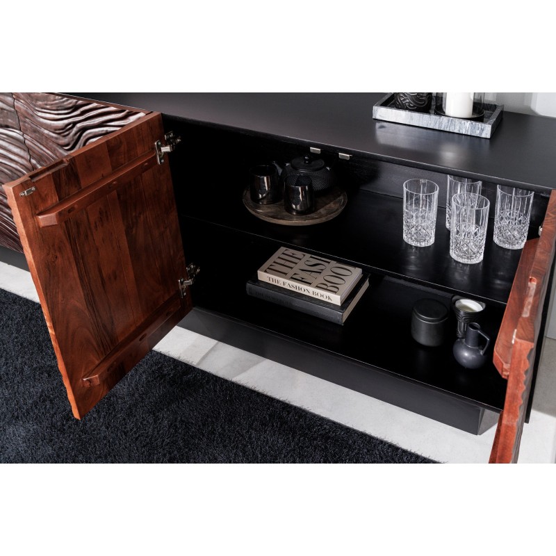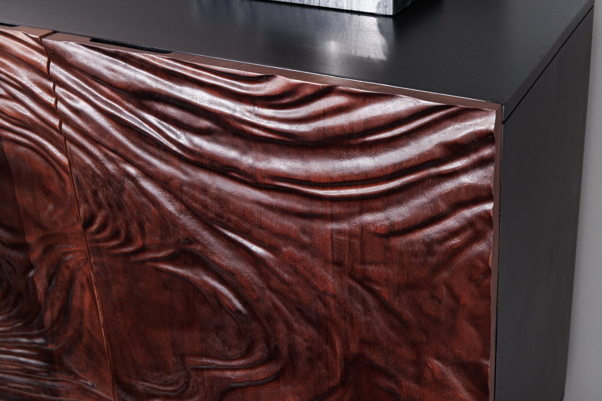Le buffet GAÏA 175 cm est une pièce spectaculaire qui allie modernité et artisanat. Ses façades sculptées en bois massif présentent des ondulations naturelles et des striures minérales, évoquant à la fois la fluidité des formes organiques et la puissance brute de la nature. Ce meuble, à la fois sculptural et raffiné, s’impose comme un élément phare d’une décoration haut de gamme.