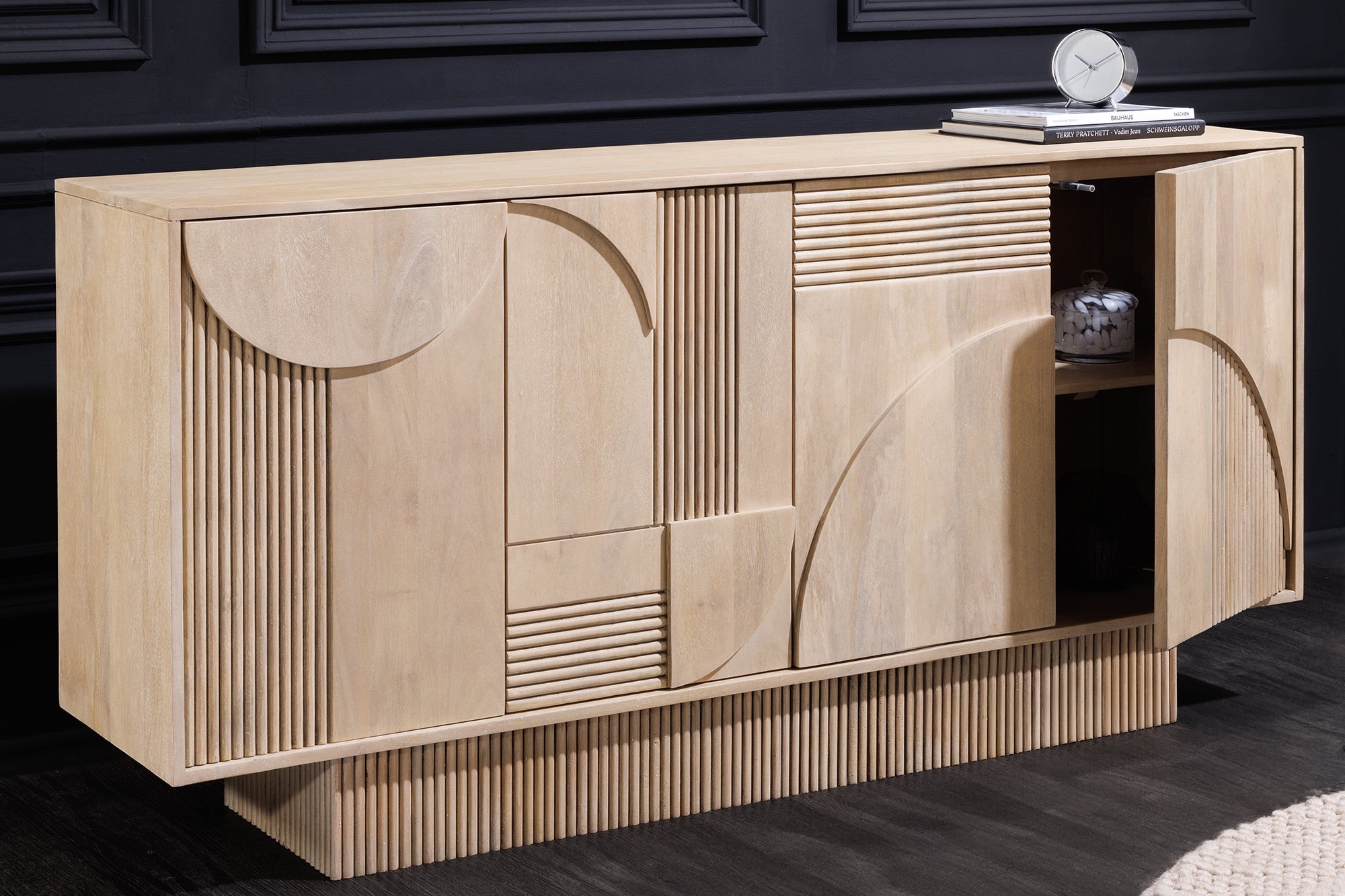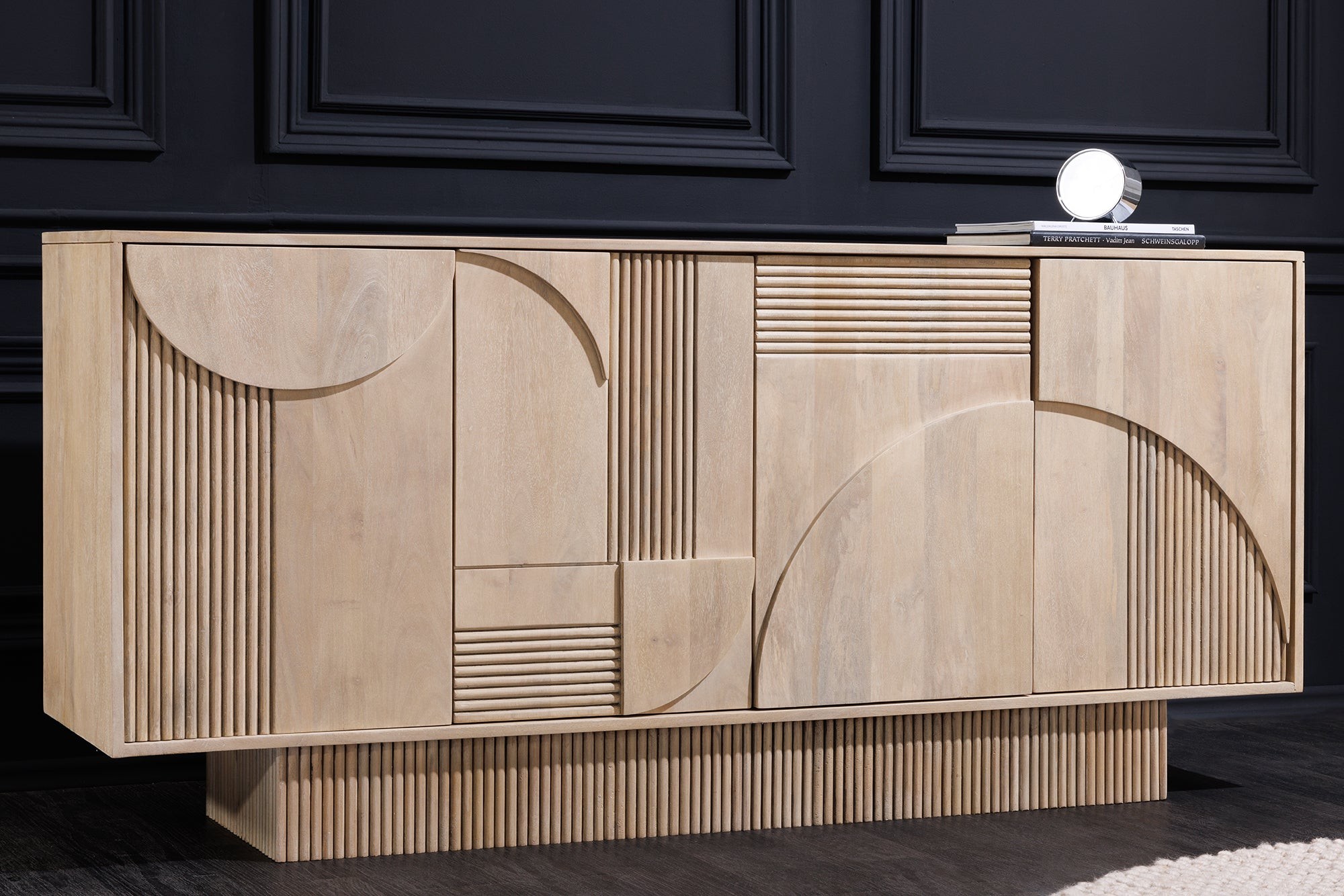 Ce buffet design se compose de 4 portes battantes ouvrant sur des espaces de rangement généreux avec étagères intégrées, parfaits pour accueillir vaisselle, linge de maison ou objets décoratifs. Sa finition claire met en valeur les motifs sculptés en 3D pour un rendu à la fois raffiné et moderne.