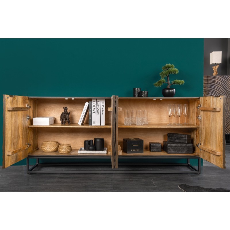 Doté de 4 portes battantes, ce buffet offre un espace de rangement généreux avec étagères intérieures, idéal pour organiser vaisselle, linge de maison et objets décoratifs. Sa structure en bois massif s’associe à un piètement en métal noir sobre, garantissant stabilité et durabilité.