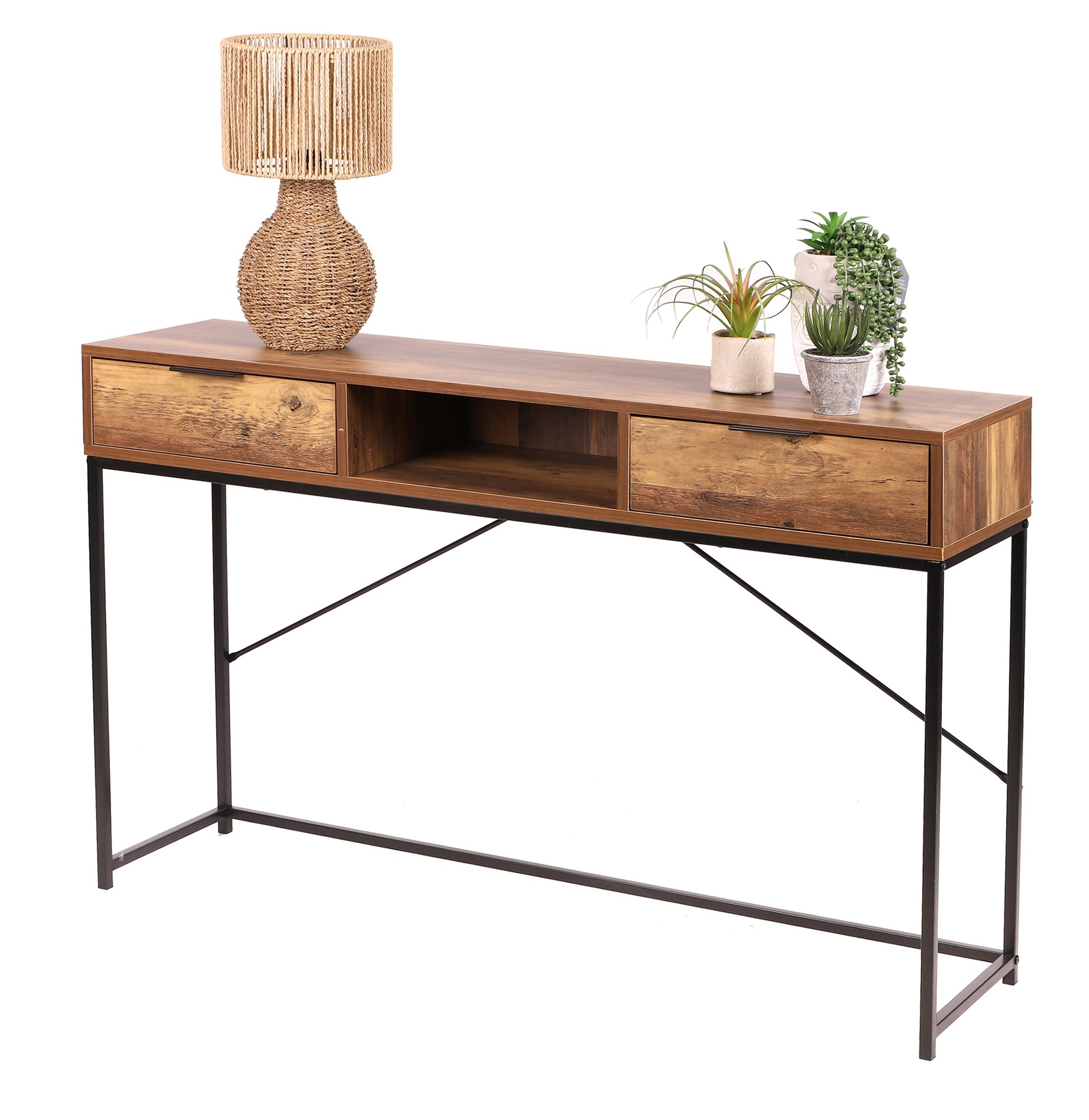 Consolle per ingresso in stile etnico con 2 cassetti – Eleganza e funzionalità, colore legno noceAggiungi un tocco di esotismo al tuo interno con questa consolle per ingresso in stile etnico. Realizzata con finiture in legno di noce, questa consolle è dotata di 2 cassetti spaziosi per riporre le tue chiavi, documenti o altri piccoli oggetti essenziali di uso quotidiano. Con dimensioni di 120x30x75 cm, si adatta perfettamente a un ingresso, un corridoio o un soggiorno, portando sia praticità che estetica al tuo spazio.Caratteristiche del prodotto:Tipo di prodotto: Consolle per ingresso con 2 cassettiDimensioni: 120 cm (lunghezza) x 30 cm (profondità) x 75 cm (altezza)Colore: Legno noceMateriale: Pannelli di particelle finitura legno nocePeso: 17 kgNumero di pacchi: 1Vantaggi della consolle per ingresso in stile etnico:Design etnico ed elegante: Lo stile etnico e la finitura in legno noce aggiungono un tocco unico e accogliente al tuo ingresso o soggiorno.Ripostiglio pratico: I 2 cassetti spaziosi ti permettono di riporre facilmente i tuoi oggetti quotidiani mantenendo il tuo spazio organizzato.Versatilità: Ideale per un ingresso, questa consolle può anche essere utilizzata in un corridoio, un soggiorno o persino come mobile da ripostiglio in una camera da letto.Robustezza e durabilità: Realizzata con materiali di qualità, questa consolle è progettata per resistere all''uso quotidiano mantenendo la sua eleganza.Facilità di manutenzione: Il piano in legno noce è facile da pulire con un panno umido, perfetto per un uso quotidiano.Perché scegliere questa consolle per ingresso in stile etnico con 2 cassetti?Stile unico: Il design etnico e la finitura in legno noce portano un tocco originale e accogliente al tuo interno.Ripostiglio ottimizzato: Con i suoi 2 cassetti, questa consolle ti permette di riporre i tuoi oggetti quotidiani aggiungendo stile al tuo spazio.Facilità di montaggio: Consegna in un unico pacco, questa consolle è facile da assemblare e installare nel tuo ingresso o soggiorno.