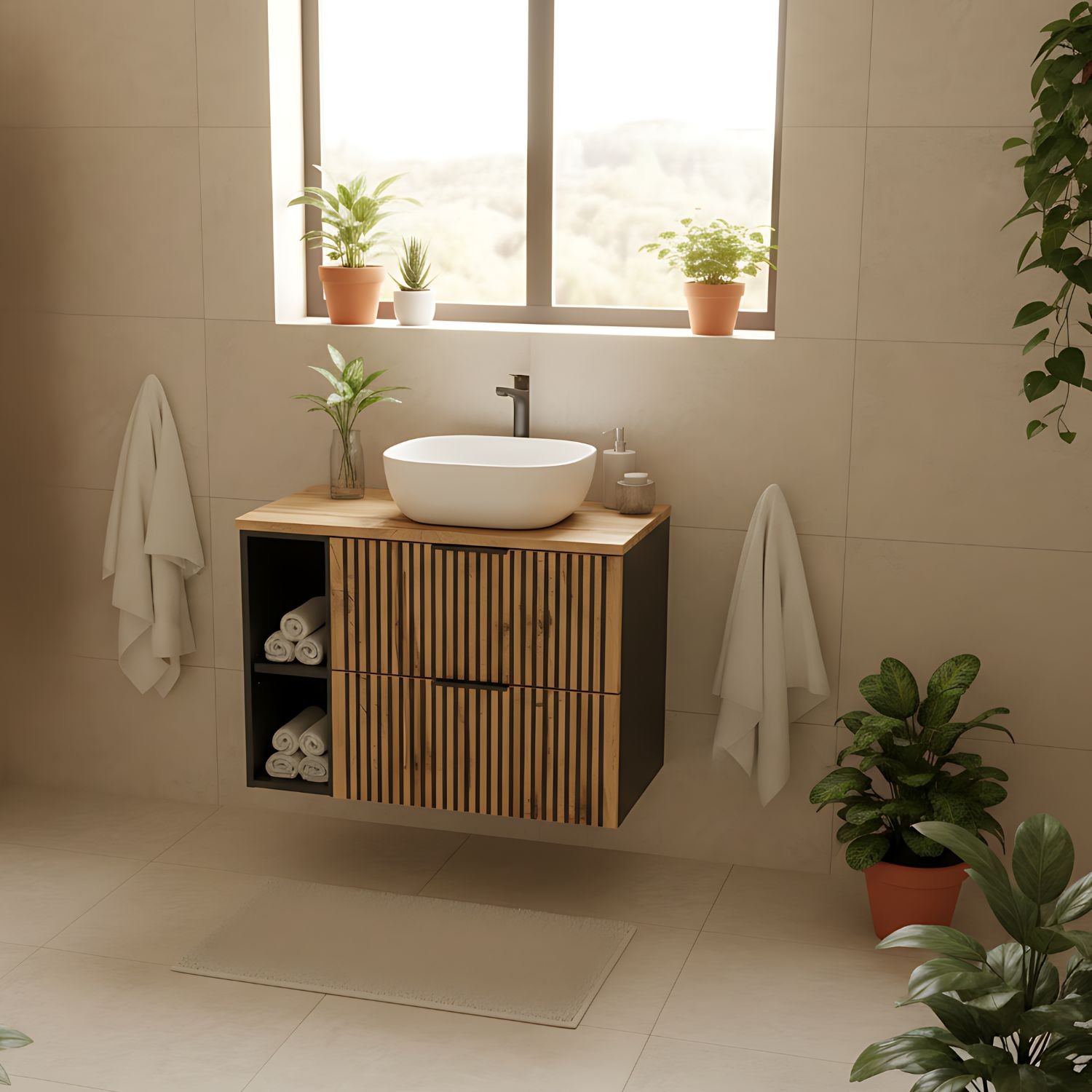Modernizza il tuo bagno con questo set KINOKO 80 cm, che combina design contemporaneo e praticità. Include due mobili sottolavabo sospesi, un piano lavabo abbinato e un lavabo bianco quadrato arrotondato da appoggio, ideale per aggiungere un tocco di raffinatezza al tuo spazio.