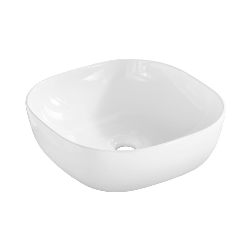 La vasque à poser en céramique blanche, à la forme carrée aux coins arrondis, complète harmonieusement cet ensemble et offre un espace de toilette pratique et élégant.