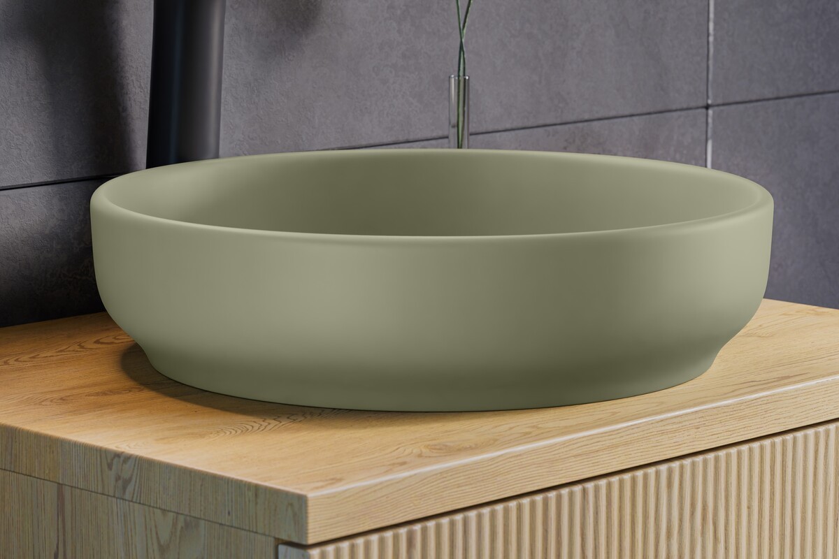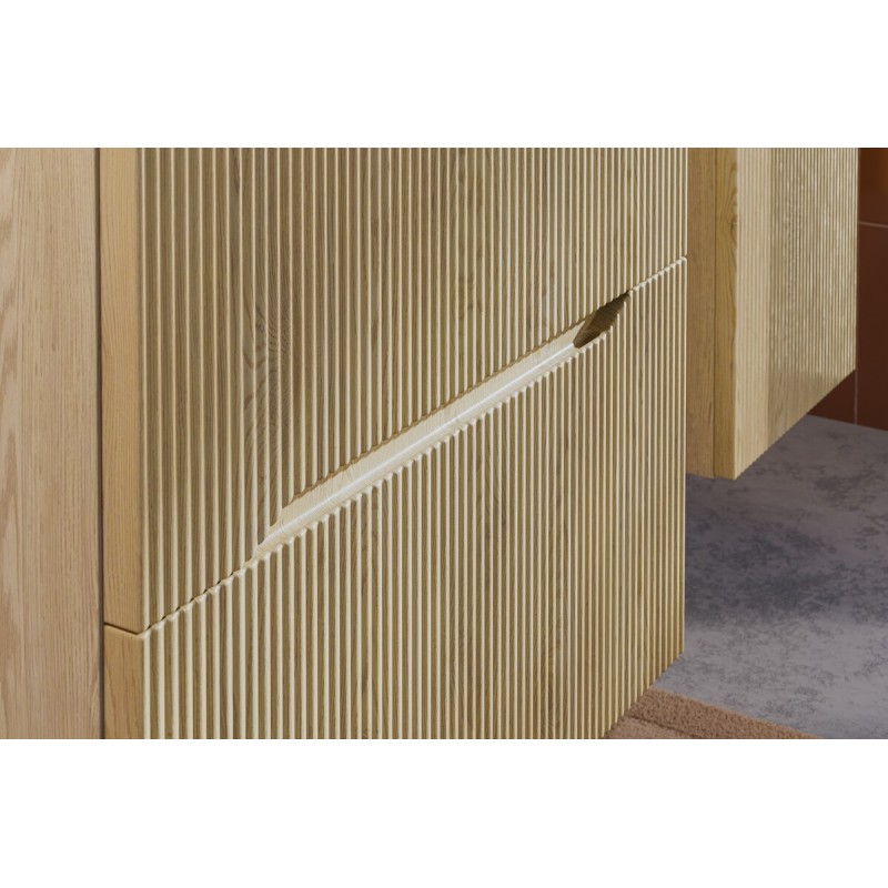 Les façades des meubles sont rainurées verticalement, un détail graphique qui apporte du relief et souligne le style naturel de la collection NATURA. Le coloris marron bois aspect chêne clair crée une ambiance chaleureuse tandis que les vasques rondes vert olive apportent une touche décorative originale et élégante.