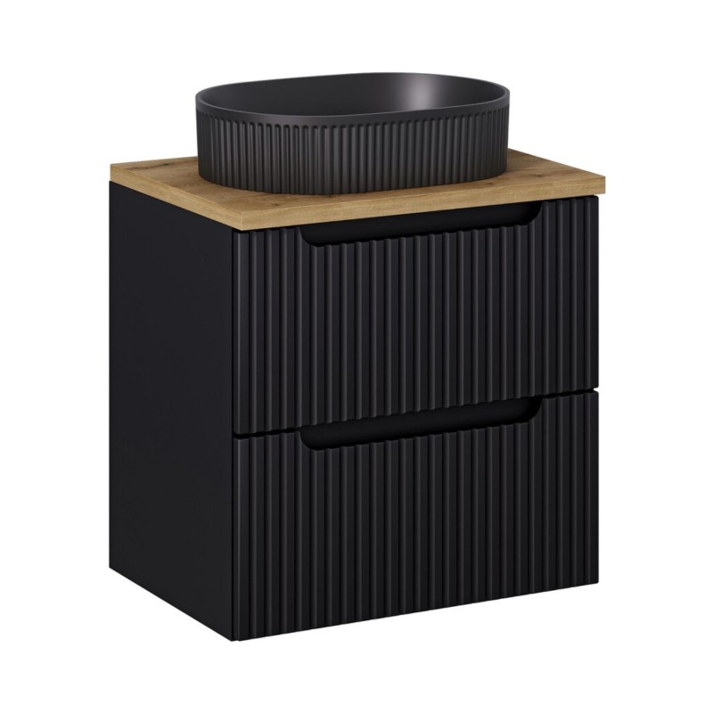 Le meuble dispose de deux tiroirs de rangement permettant d’organiser facilement les accessoires du quotidien. La vasque à poser ovale rainurée en céramique noire apporte une touche décorative forte et renforce le caractère moderne de cette composition.