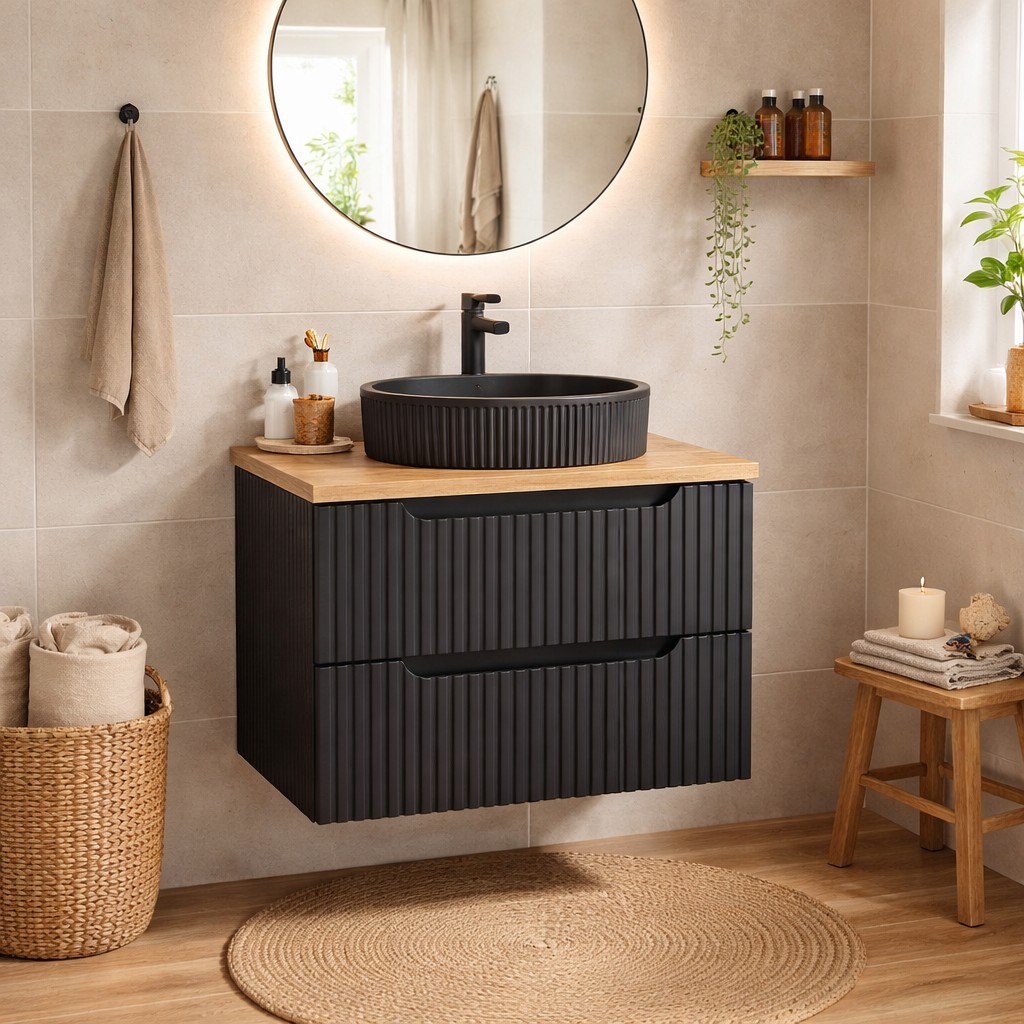 La façade du meuble présente un motif rainuré verticalement qui apporte du relief et souligne l’esthétique design de l’ensemble. L’association du noir mat et du bois clair crée un contraste harmonieux qui s’intègre parfaitement dans une salle de bain contemporaine.