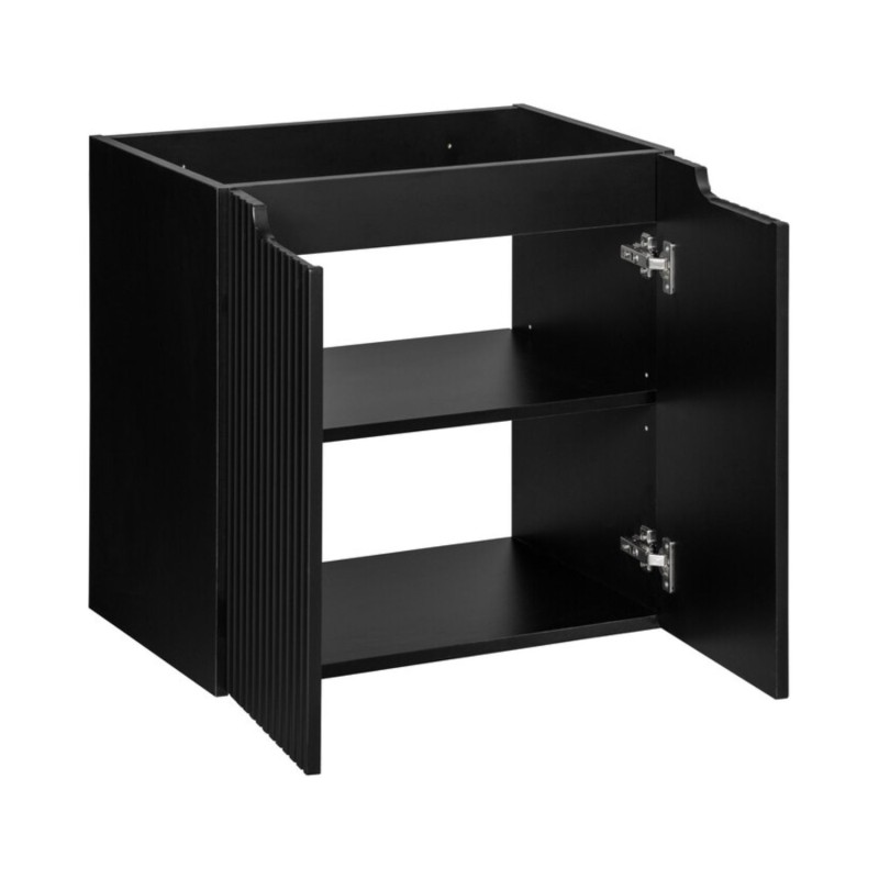 Le meuble est équipé de deux portes battantes permettant d’accéder à un espace de rangement pratique pour les produits et accessoires du quotidien. La vasque à poser ovale rainurée en céramique noire apporte une touche décorative forte et complète l’ensemble avec élégance.