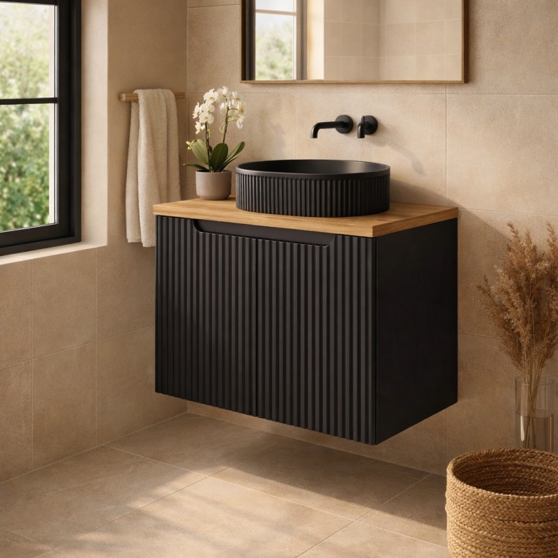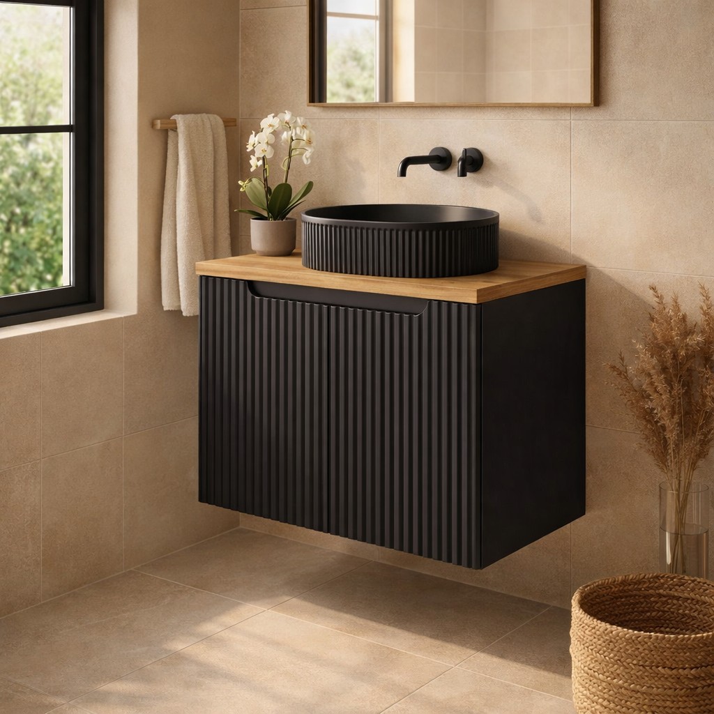 La façade du meuble présente un motif rainuré verticalement qui apporte du relief et souligne son style design. Le contraste entre le noir mat et le bois clair du plan pour vasque crée une esthétique contemporaine qui s’intègre parfaitement dans différents styles de salles de bain.