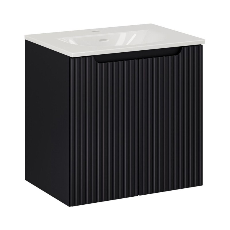 La façade du meuble présente un motif rainuré verticalement qui apporte du relief et souligne son style design. Le coloris noir mat renforce l’esthétique moderne de l’ensemble et s’intègre facilement dans différents styles d’aménagement.