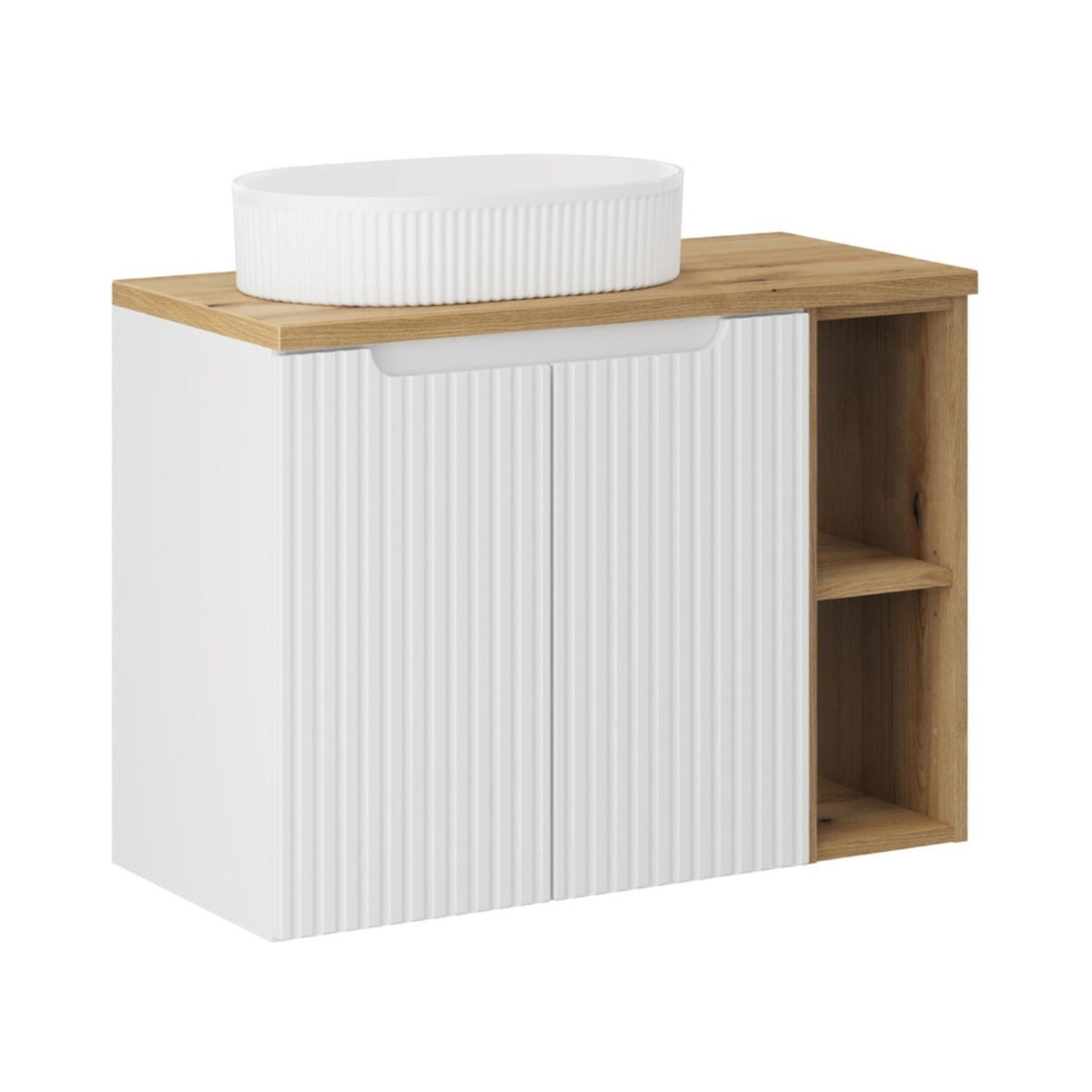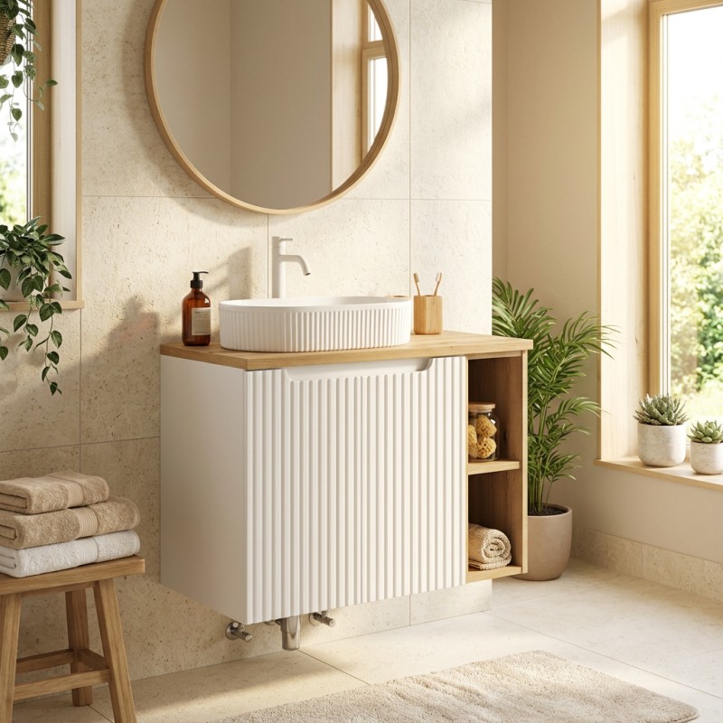 L’ensemble de salle de bain VANO 80 cm est idéal pour aménager un espace compact avec style et fonctionnalité. Il se compose d’un meuble sous vasque suspendu blanc mat avec façades rainurées verticalement, d’un meuble avec niches visibles, d’un plan pour vasque aspect chêne clair ainsi que d’une vasque à poser ovale.