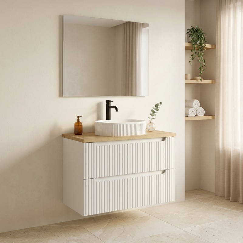L’ensemble de salle de bain VANO 80 cm est idéal pour aménager une salle de bain moderne et fonctionnelle dans un format compact. Il se compose d’un meuble sous vasque suspendu blanc mat avec façades rainurées verticalement, d’un plan pour vasque aspect chêne clair ainsi que d’une vasque à poser ovale.