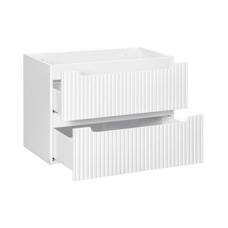 L’ensemble de salle de bain VANO 80 cm est idéal pour créer un espace à la fois moderne, pratique et épuré. Il se compose d’un meuble sous vasque suspendu blanc mat avec façades rainurées verticalement ainsi que d’une vasque encastrée blanche.