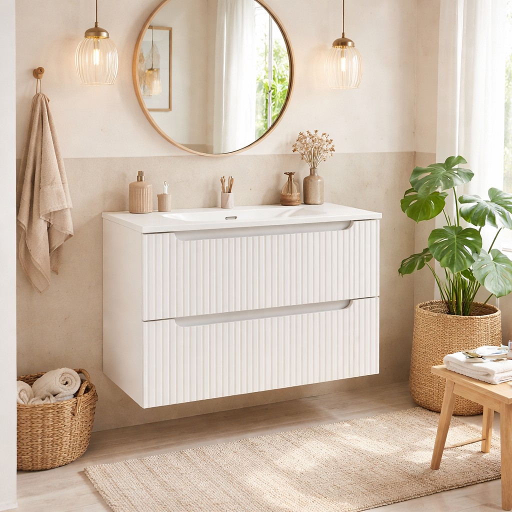 Son design entièrement blanc apporte luminosité et élégance à votre salle de bain. Les façades rainurées ajoutent du relief et renforcent le style contemporain de la collection VANO, tout en conservant une esthétique minimaliste.