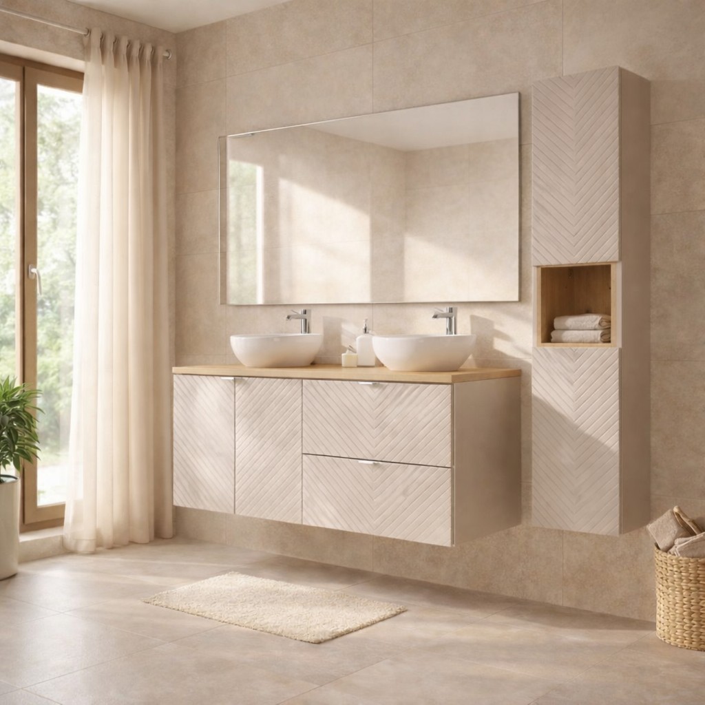 Transformez votre salle de bain avec cet ensemble AOKI 120 cm complet et harmonieux. Il réunit un meuble sous vasque à tiroirs, un meuble sous vasque à placards, un plan vasque aspect chêne, deux vasques rondes blanches à poser, une colonne de rangement haute et une étagère cubique intégrée à la colonne. Un set aux finitions cachemire mat, idéal pour une décoration japandi moderne et épurée.