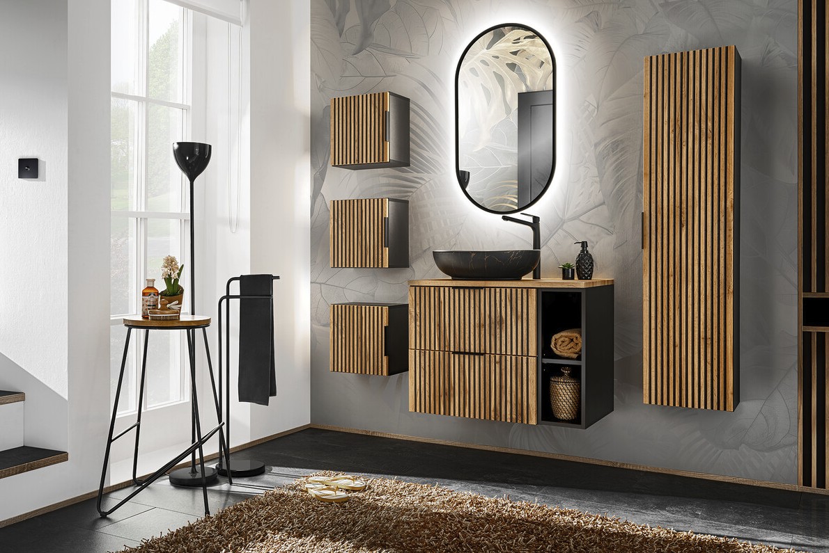 Rinnova il tuo bagno con questo set KINOKO 80 cm, pensato per offrire stile e praticità nella vita quotidiana. Si compone di un mobile sottolavabo sospeso, di un piano lavabo, di un lavabo rotondo nero effetto marmo e di uno specchio LED ovale che fornisce un'illuminazione precisa ed elegante. A questi si aggiungono 3 mobili contenitori cubici e 1 colonna per il bagno.