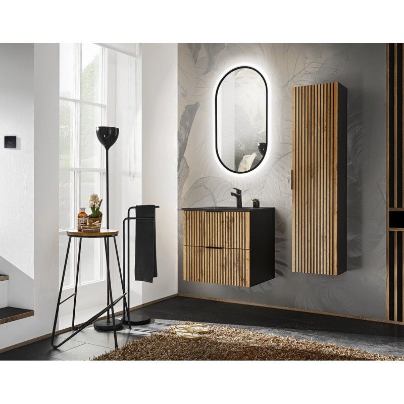 Porta lo stile del tuo bagno a un nuovo livello con il set KINOKO 60 cm, una soluzione di design con contrasti eleganti che combina legno caldo e un moderno lavabo nero. Compatto ma estremamente funzionale, include un mobile sottolavabo sospeso, un lavabo incassato nero e uno specchio LED che offre un'illuminazione moderna e confortevole.