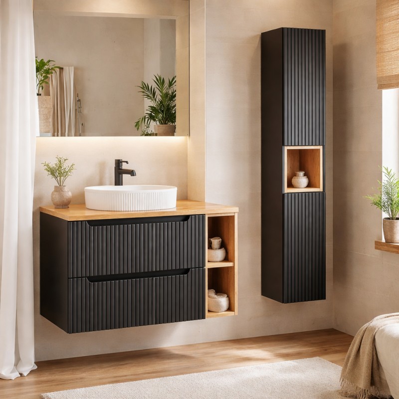 Les façades des meubles noirs présentent un motif rainuré verticalement qui apporte du relief et renforce le style design de l’ensemble. Le contraste entre le noir mat et le bois clair crée une atmosphère contemporaine qui s’intègre parfaitement dans différents styles de salles de bain.