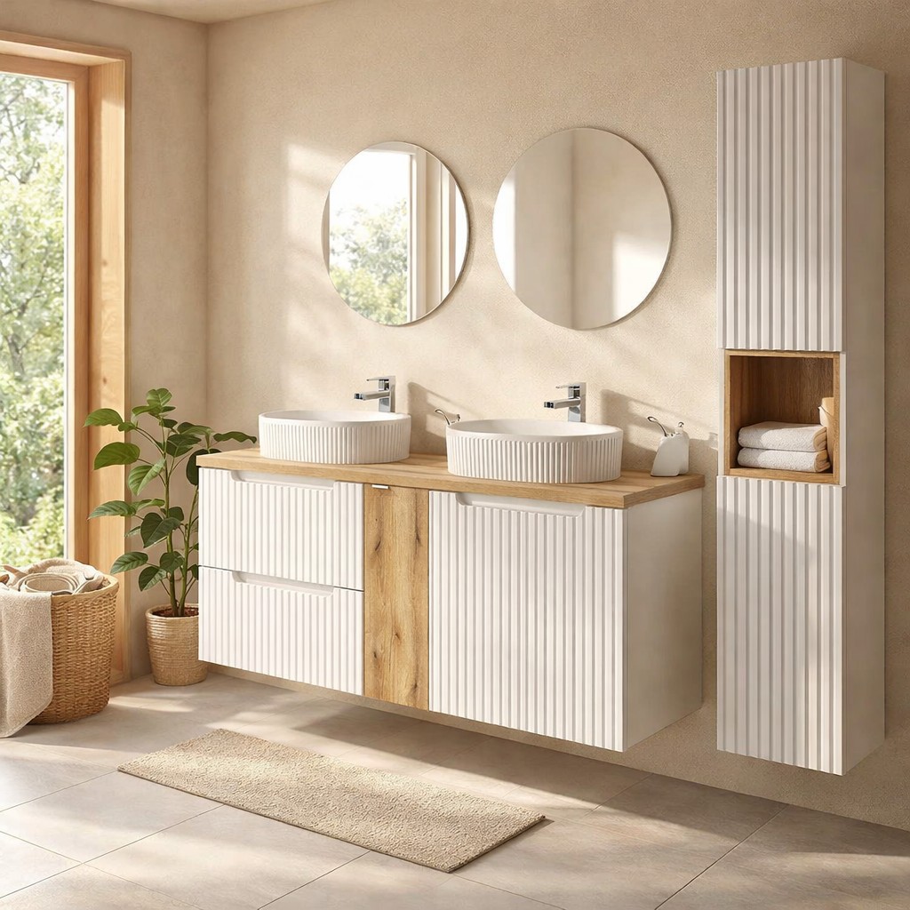 L’association du blanc mat et du chêne clair crée un contraste chaleureux et contemporain. Les façades rainurées apportent du relief et renforcent l’identité graphique de la collection VANO, idéale pour une salle de bain au style design et épuré.