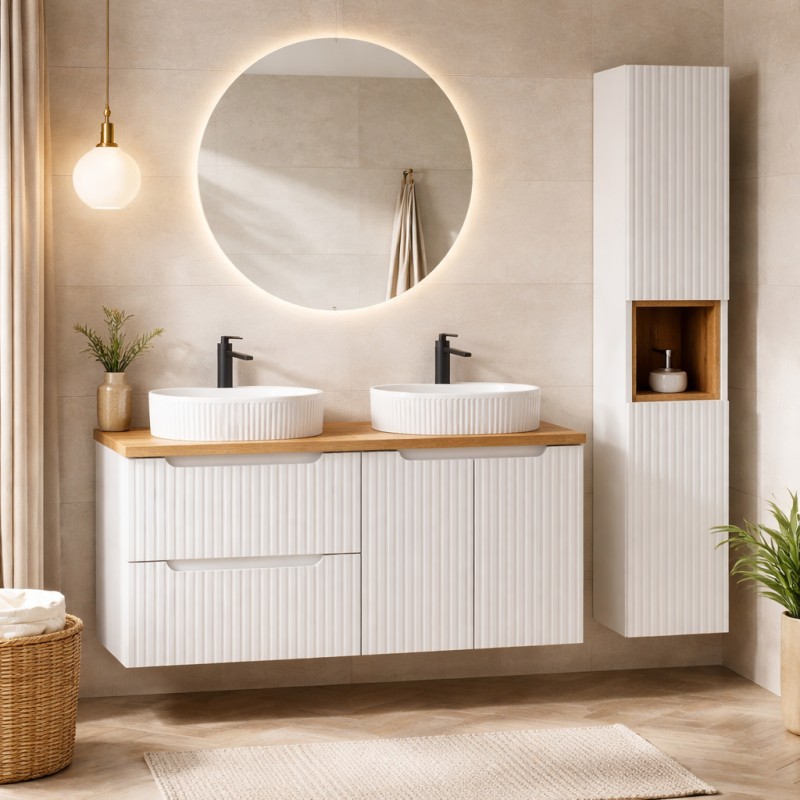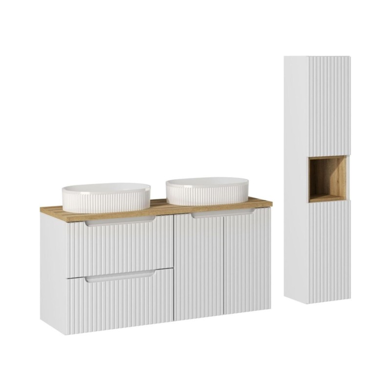 L’ensemble de salle de bain VANO 150 cm est une solution complète pour aménager une salle de bain moderne, élégante et fonctionnelle. Il se compose de meubles sous vasque suspendus blanc mat avec façades rainurées verticalement, d’un plan pour vasque aspect chêne clair, de deux vasques à poser ovales ainsi que d’une colonne avec cube intégré.