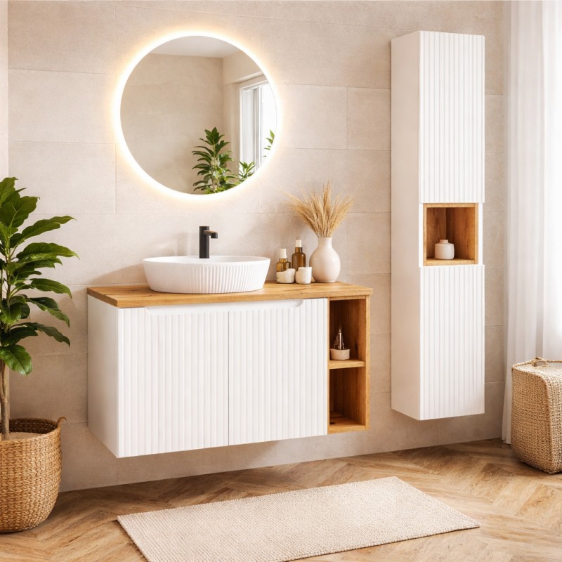 L’ensemble de salle de bain VANO 130 cm est une solution complète pour aménager une salle de bain moderne et fonctionnelle. Il se compose d’un meuble sous vasque suspendu blanc mat avec façades rainurées verticalement, d’un meuble avec niches visibles, d’un plan pour vasque aspect chêne clair, d’une vasque à poser ovale ainsi que d’une colonne avec cube intégré.