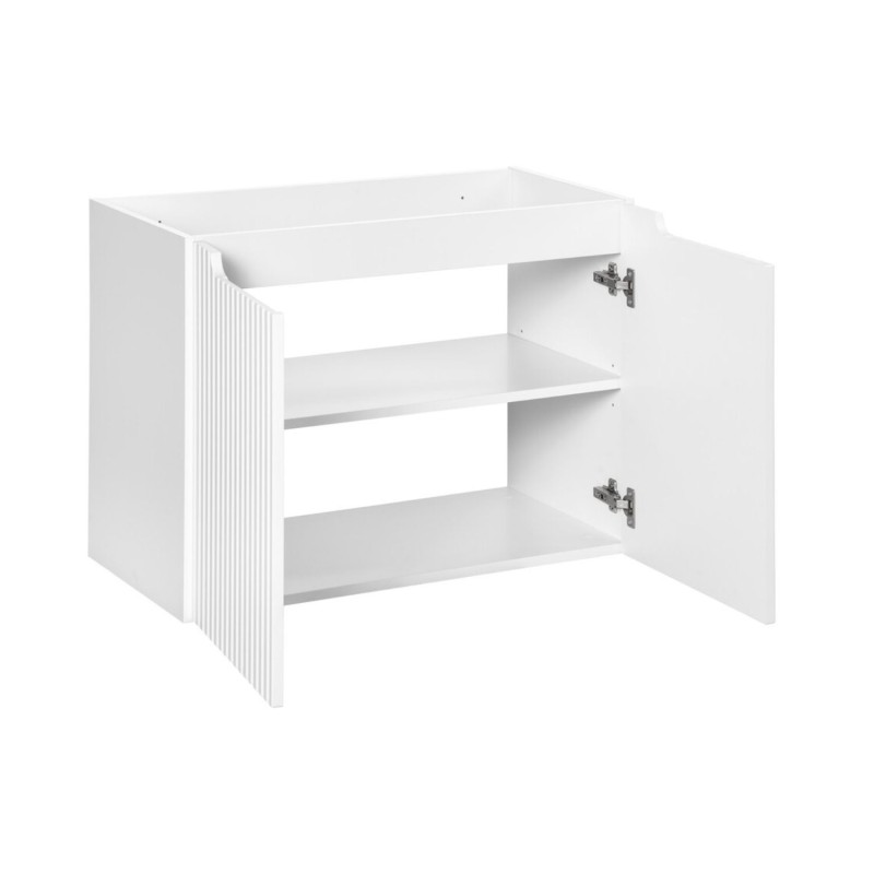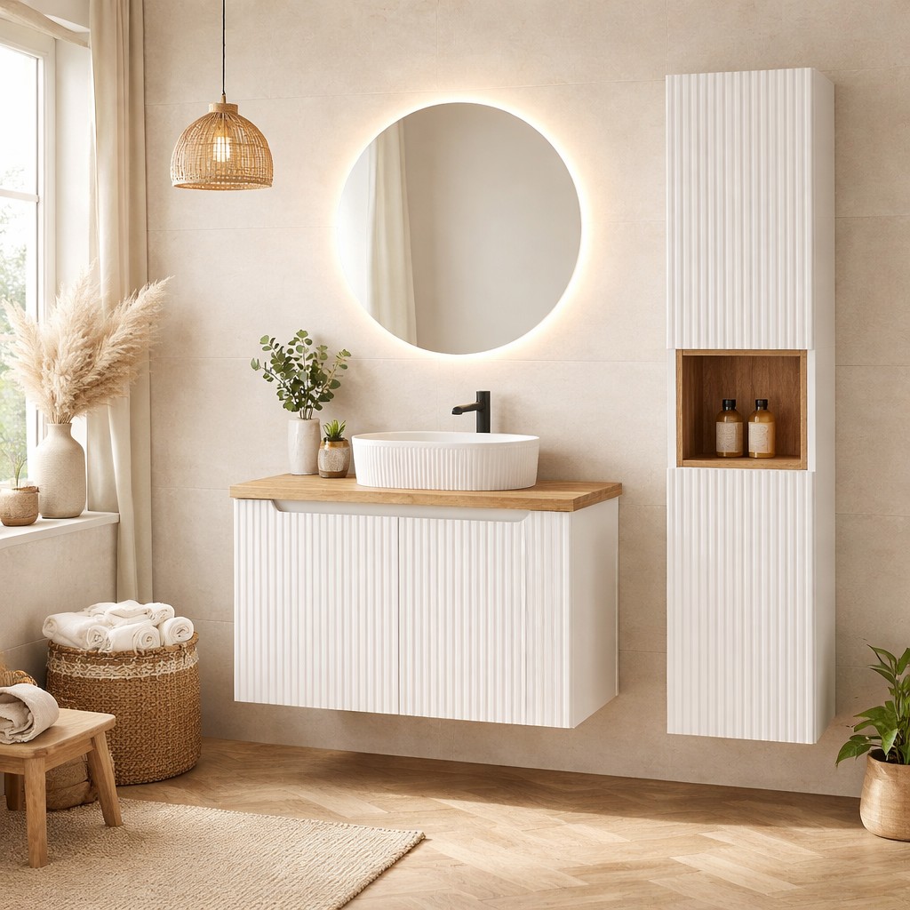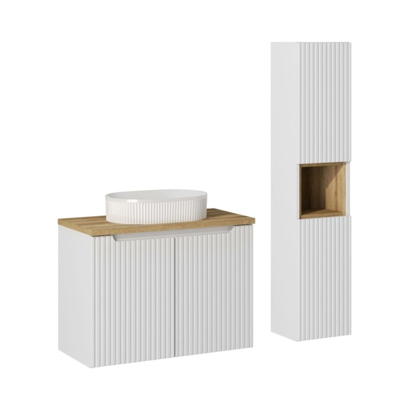 L’ensemble de salle de bain VANO 110 cm est une solution complète et élégante pour aménager une salle de bain moderne et fonctionnelle. Il comprend un meuble sous vasque suspendu à placards blanc mat avec façades rainurées verticalement, un plan pour vasque aspect chêne clair, une vasque à poser ovale ainsi qu’une colonne avec cube intégré.