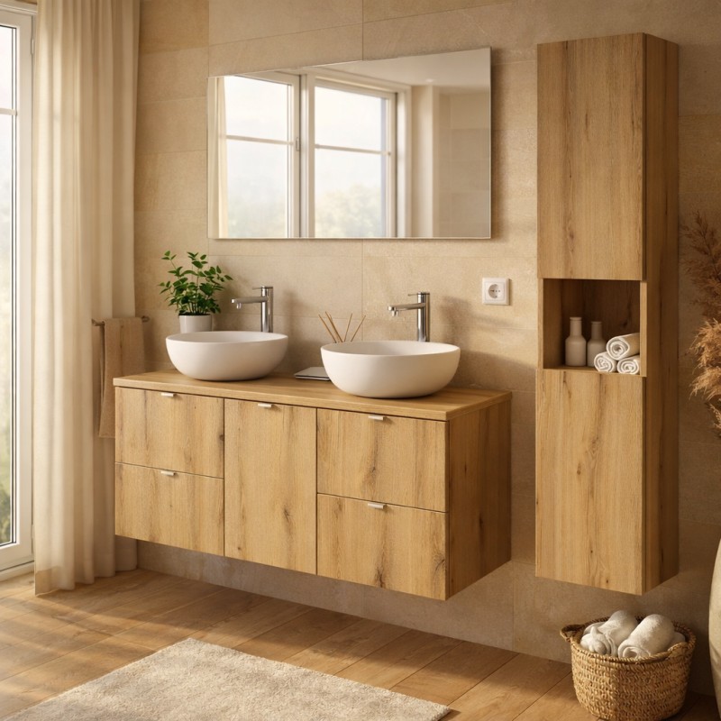 La sua finitura effetto rovere scuro aggiunge calore ed eleganza, integrandosi perfettamente in un bagno moderno o naturale.