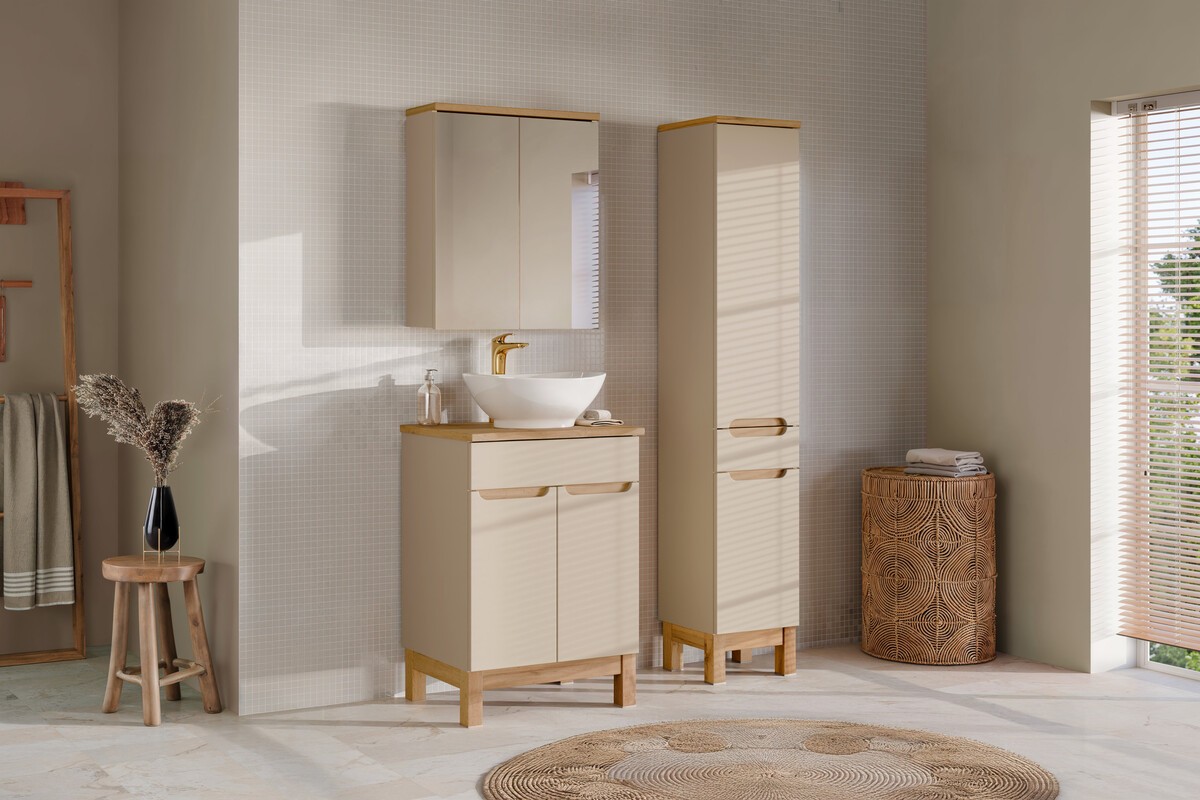 La colonna da bagno completa questo set offrendo uno spazio di stoccaggio verticale aggiuntivo, ideale per mantenere l'ambiente ordinato.