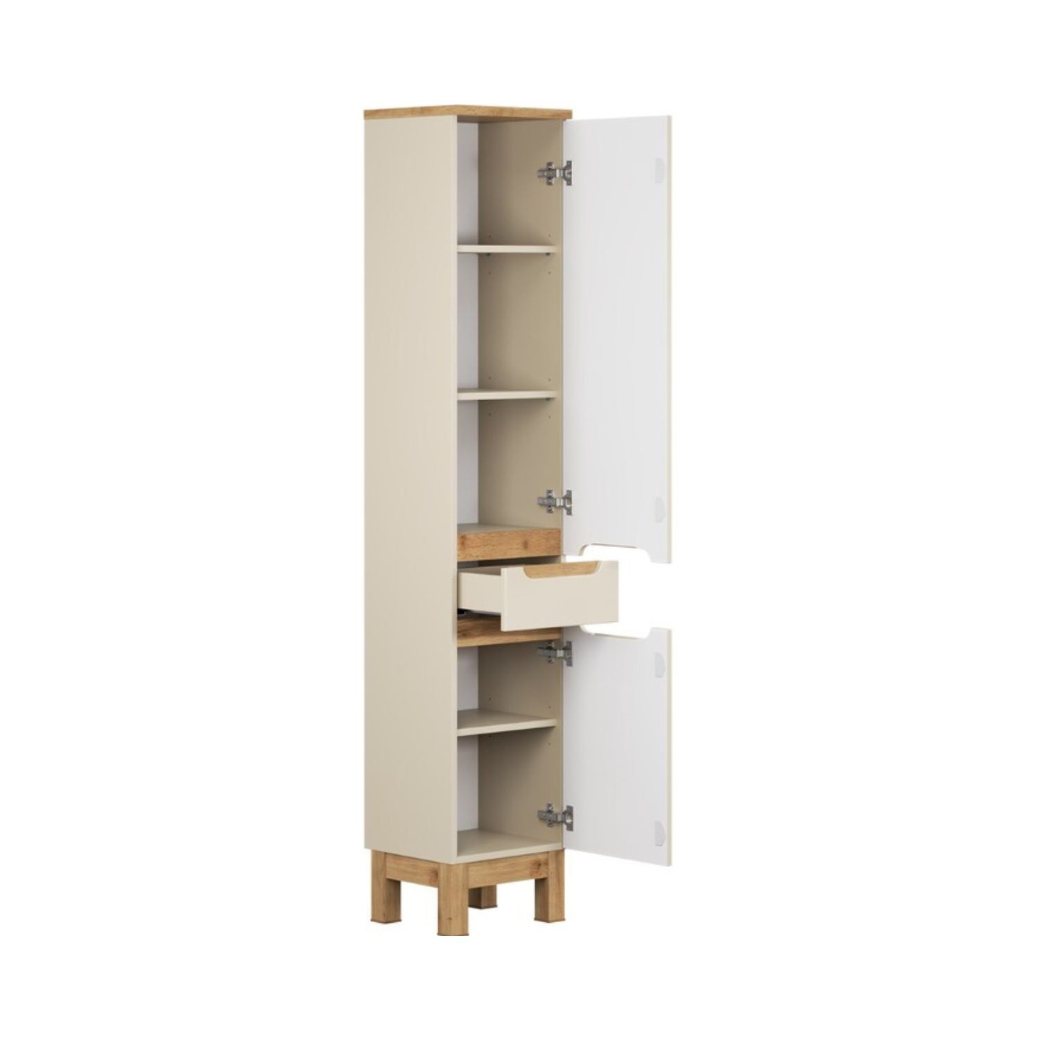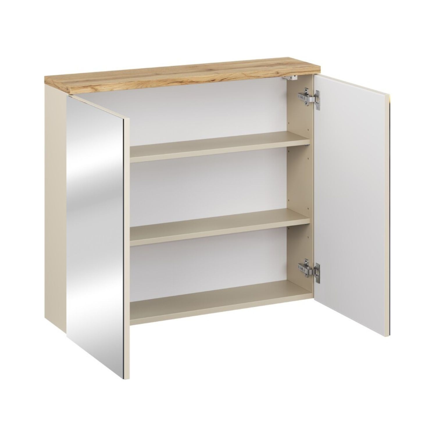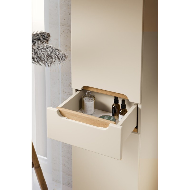 Son coloris cachemire associé à un aspect chêne clair crée une ambiance douce et naturelle, idéale pour une salle de bain moderne et apaisante.
