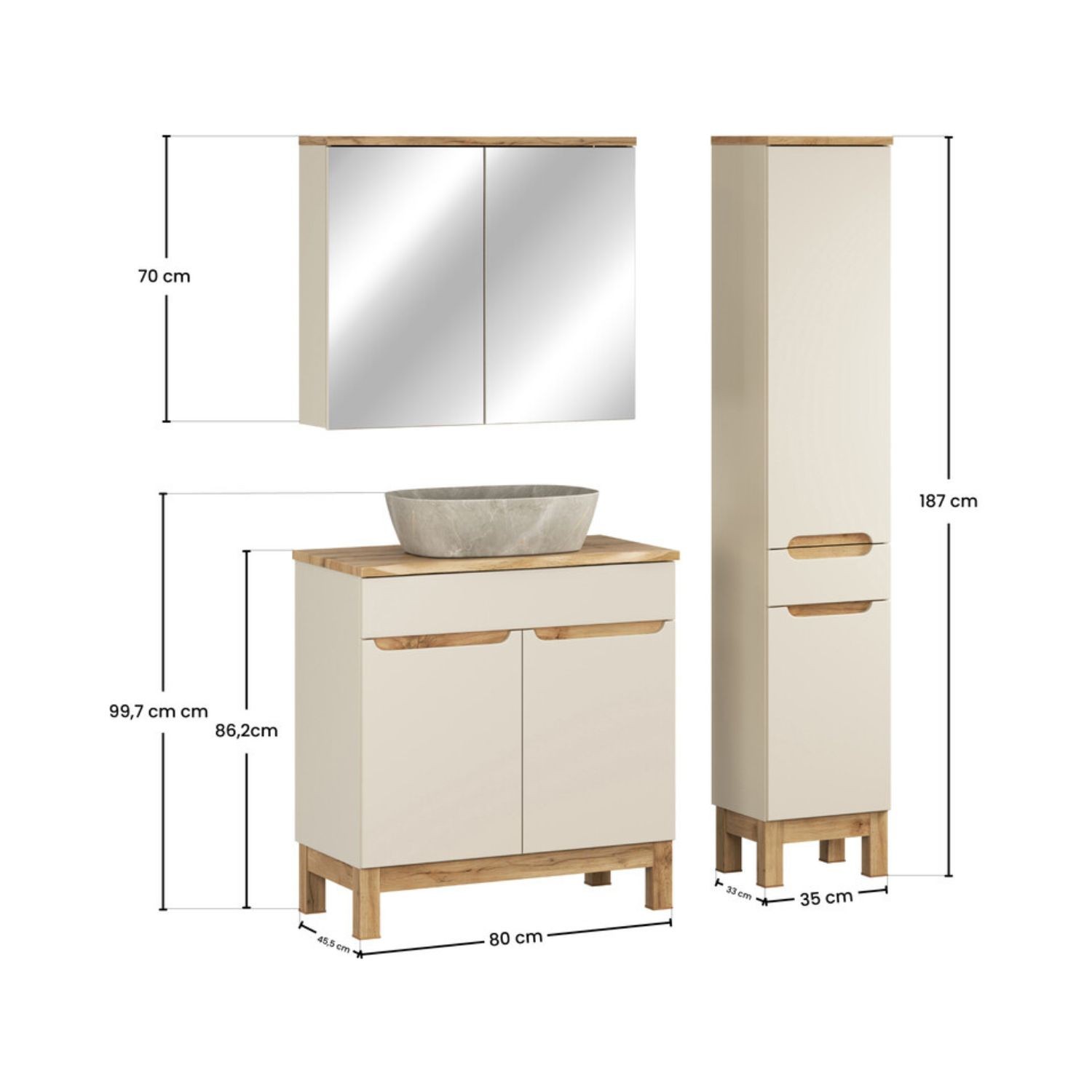 | dimensions_des_elements_(en_cm) | 1 meuble sous vasque 2 portes : 80x84x46 + 1 plan pour vasque biseauté : 80,6x2,2x47,5 + 1 vasque à poser : 50,5x13,5x38,5 + 1 meuble de rangement suspendu 2 portes avec miroirs : 80x70x20 + 1 colonne : 35x187x33 |