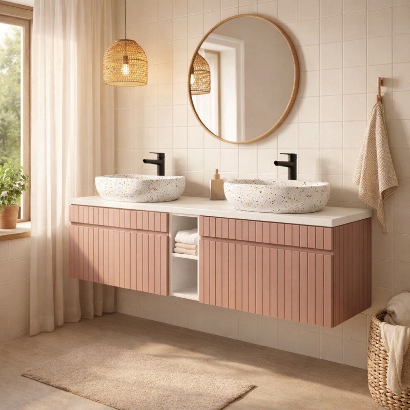 L’ensemble ICON 180 cm se distingue par son style contemporain et son coloris rose poudré élégant qui apporte une touche douce et originale à votre salle de bain. Les façades des meubles sous vasque présentent un aspect rainuré verticalement, un détail esthétique qui souligne le caractère moderne de cette composition.