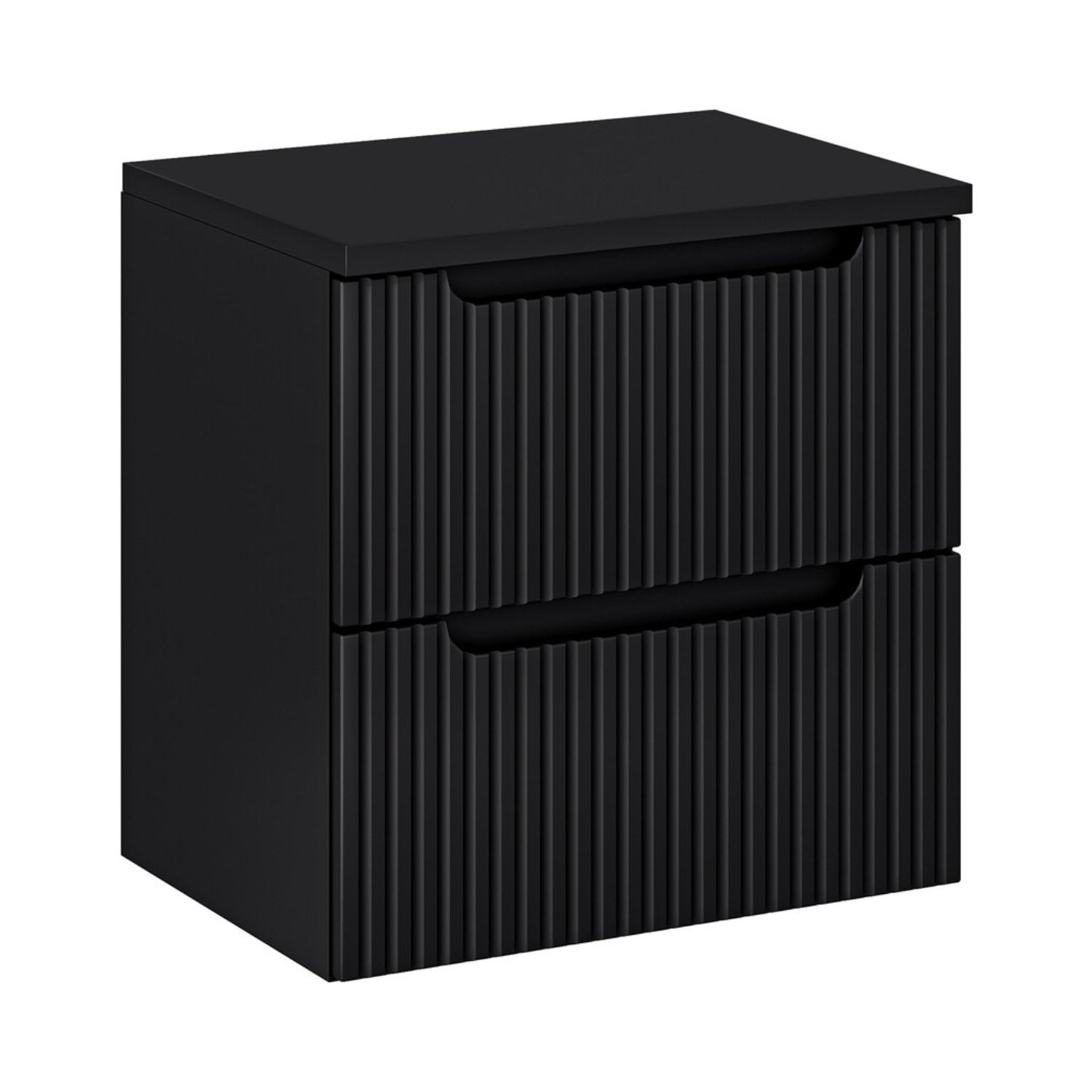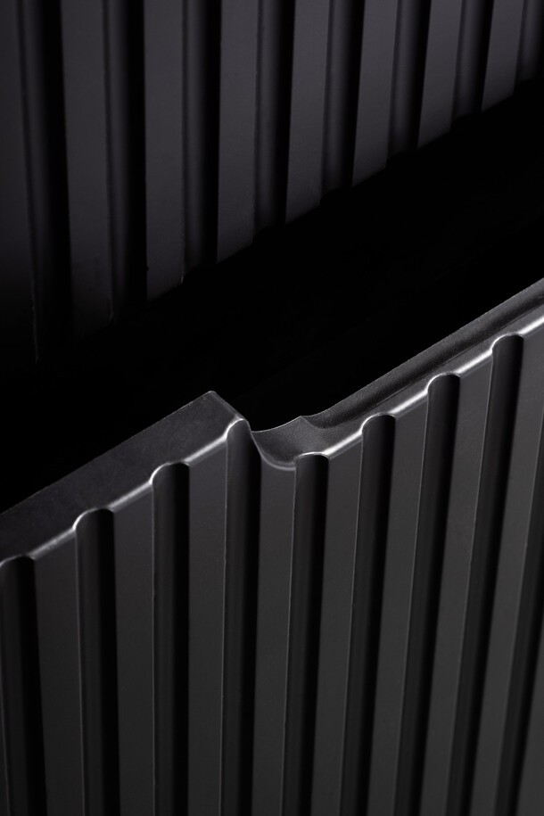 La façade du meuble présente un motif rainuré verticalement qui apporte du relief et une touche décorative contemporaine. Le coloris noir mat renforce l’esthétique moderne de l’ensemble et s’intègre facilement dans différents styles d’aménagement.
