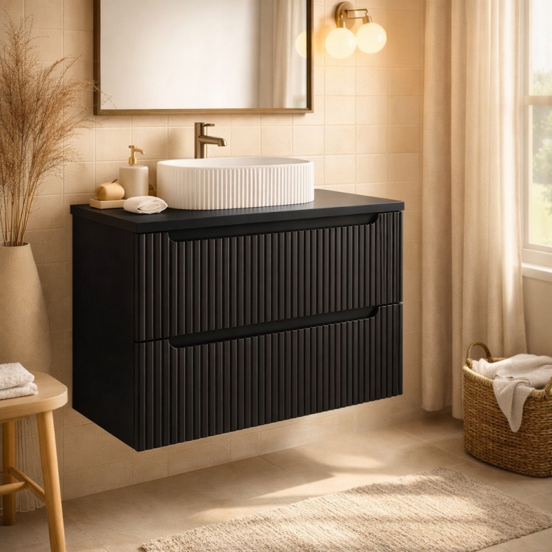 Le meuble sous vasque suspendu VANO 80 cm combine design contemporain et fonctionnalité pour aménager une salle de bain moderne et élégante. Cette composition comprend un meuble sous vasque noir mat et un plan pour vasque noir mat pour un ensemble minimaliste et tendance.
