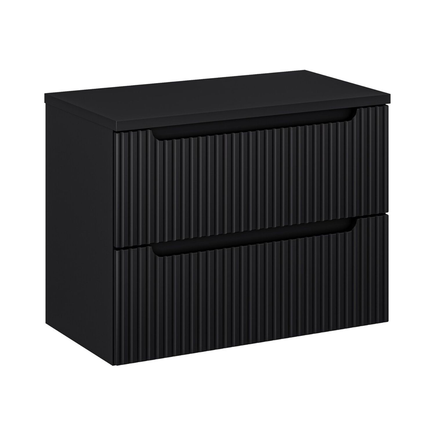 La façade du meuble présente un motif rainuré verticalement qui apporte du relief et renforce le style design de la collection. Le coloris noir mat confère une esthétique moderne et intemporelle qui s’intègre facilement dans différents styles d’intérieurs.