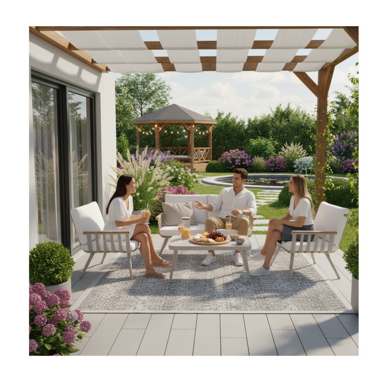 Apportez une touche de modernité et de confort à votre extérieur avec le salon de jardin LUMERA. Cet ensemble élégant se compose d’un canapé deux places, de deux fauteuils confortables et d’une table basse rectangulaire, créant un espace convivial idéal pour profiter des beaux jours sur votre terrasse, dans votre jardin ou sur votre balcon.