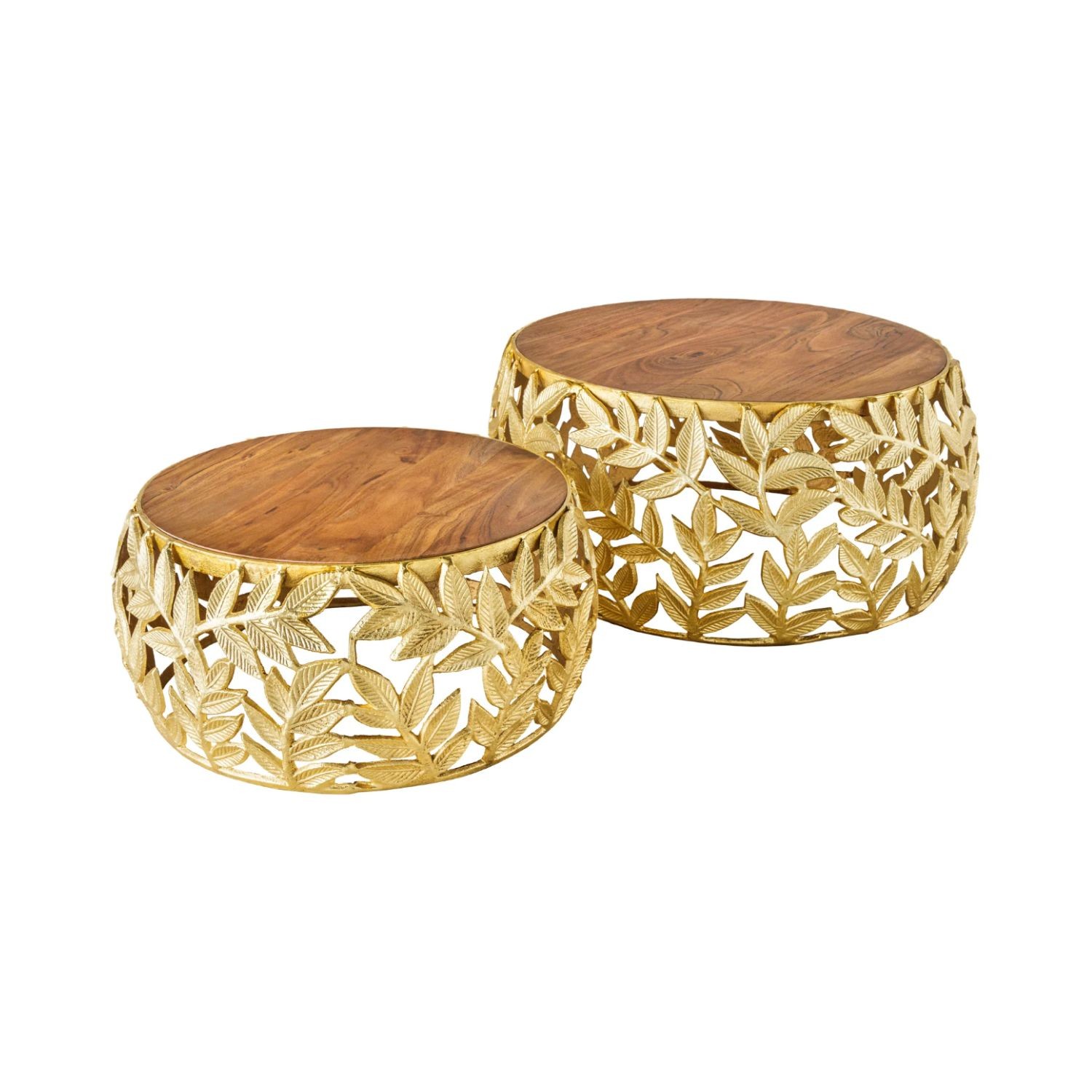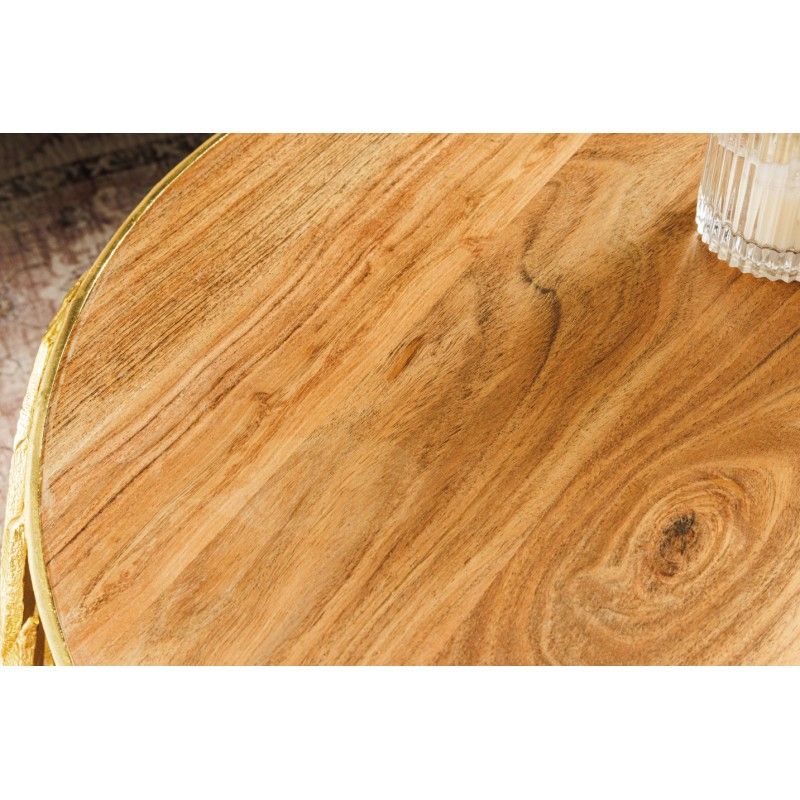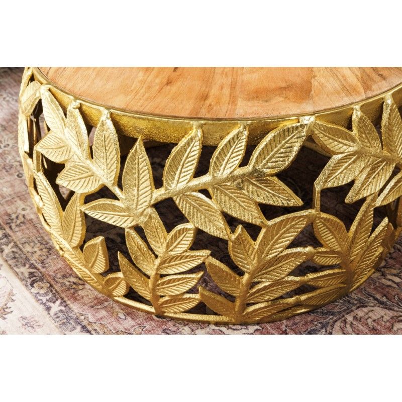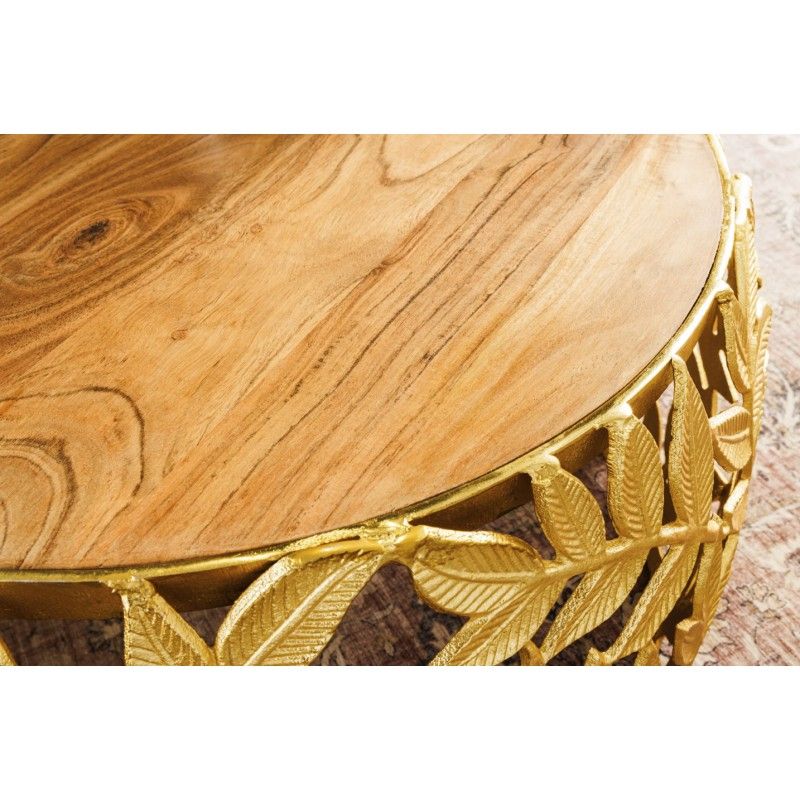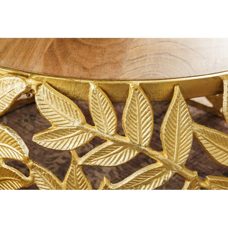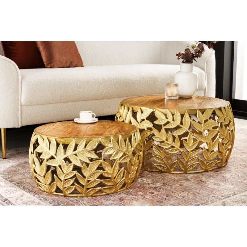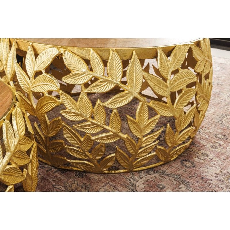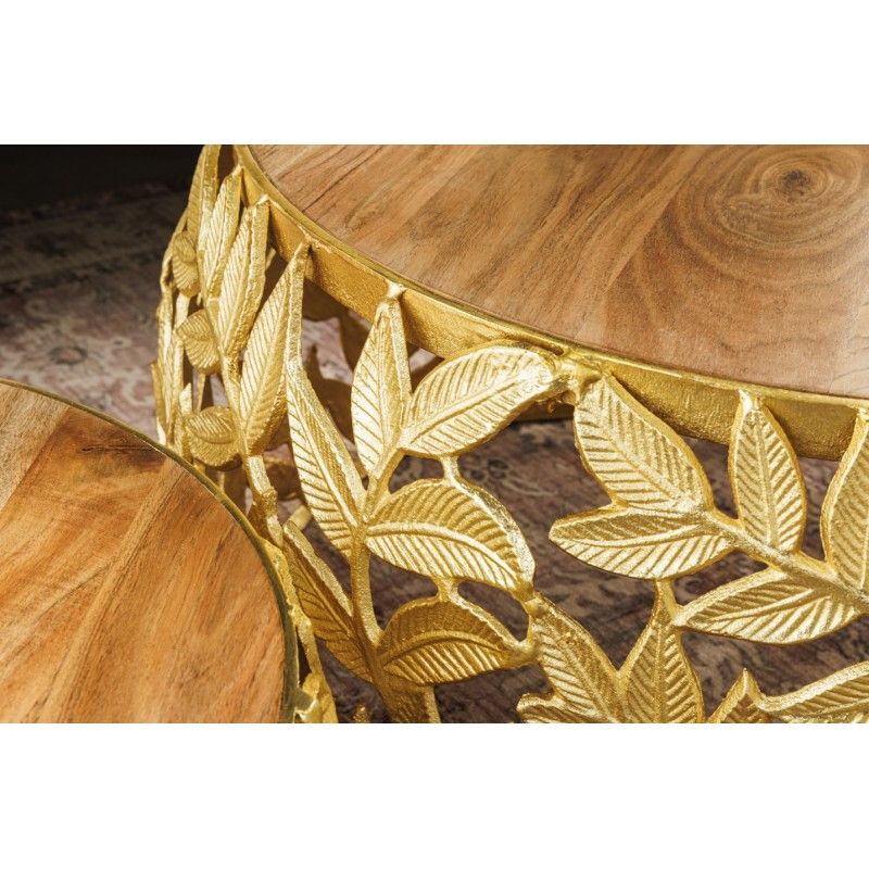 Chaque table basse repose sur une structure arrondie ajourée ornée d’un motif feuillage, apportant une touche végétale subtile et graphique. Le contraste entre l’aluminium doré brillant et le bois d’acacia foncé confère à l’ensemble un caractère unique, à la fois décoratif et fonctionnel. Pensées pour être utilisées ensemble ou séparément, ces tables basses METRIX s’adaptent naturellement aux intérieurs design.