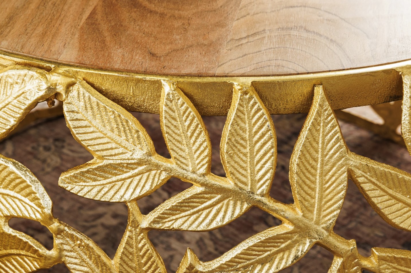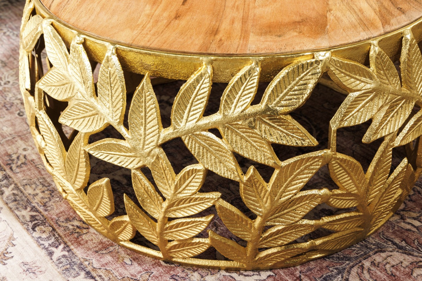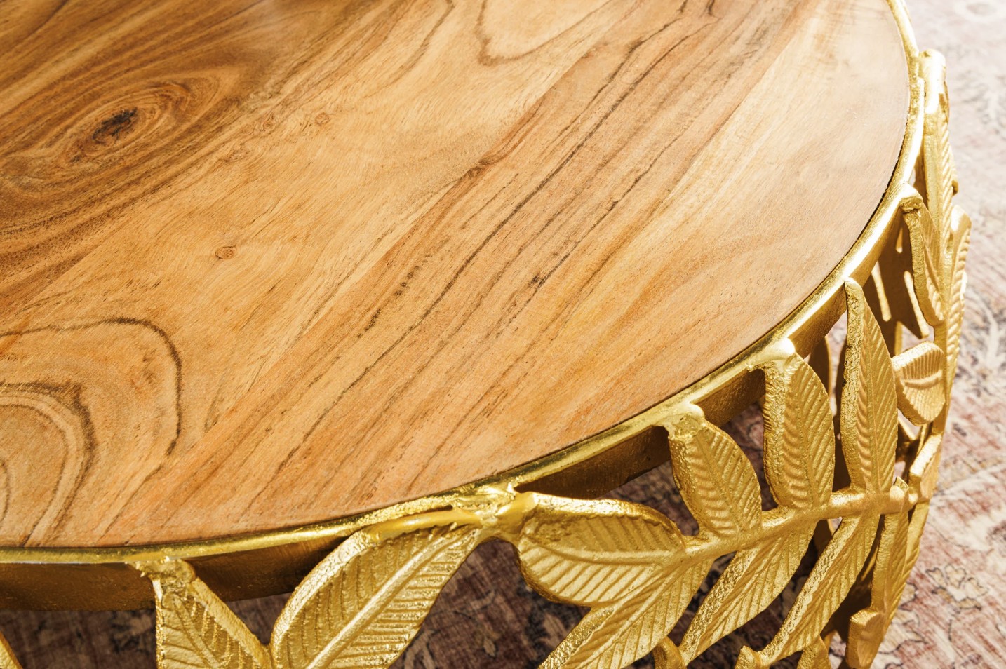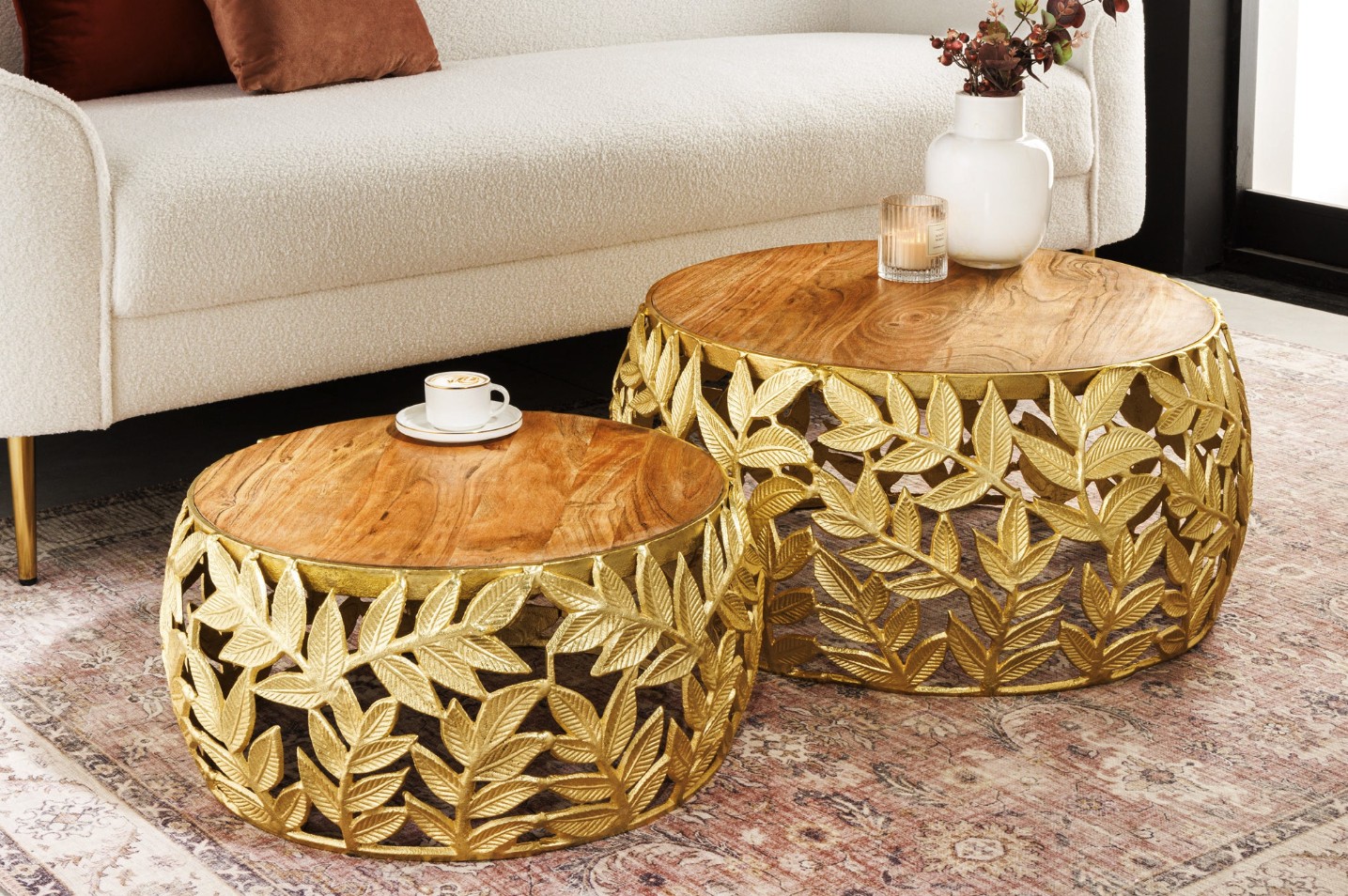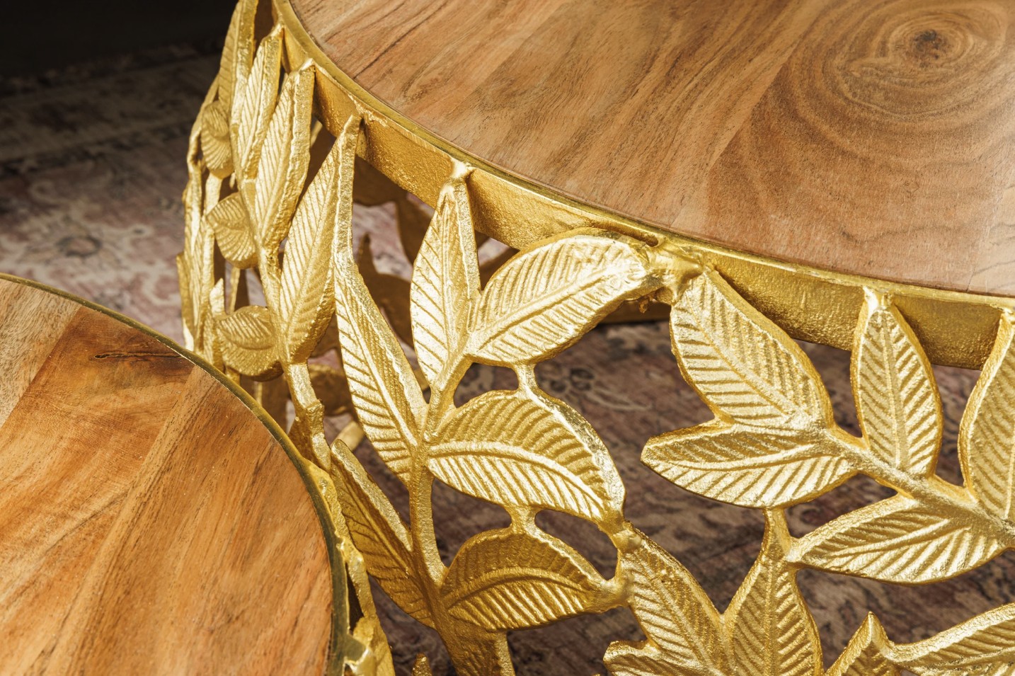 Chaque table basse repose sur une structure arrondie ajourée ornée d’un motif feuillage, apportant une touche végétale subtile et graphique. Le contraste entre l’aluminium doré brillant et le bois d’acacia foncé confère à l’ensemble un caractère unique, à la fois décoratif et fonctionnel. Pensées pour être utilisées ensemble ou séparément, ces tables basses METRIX s’adaptent naturellement aux intérieurs design.