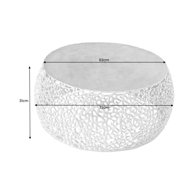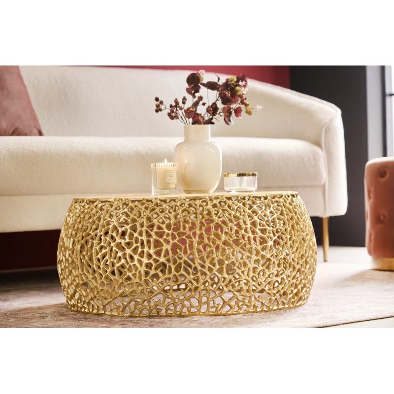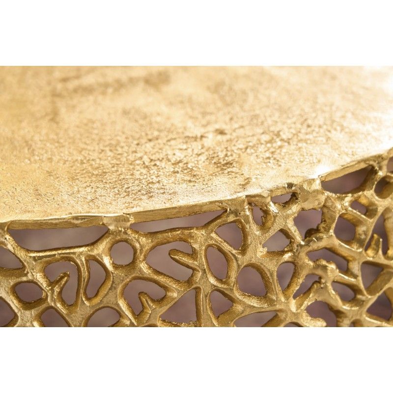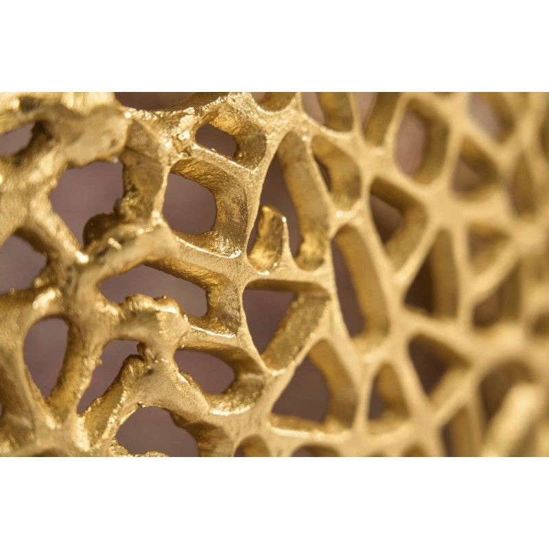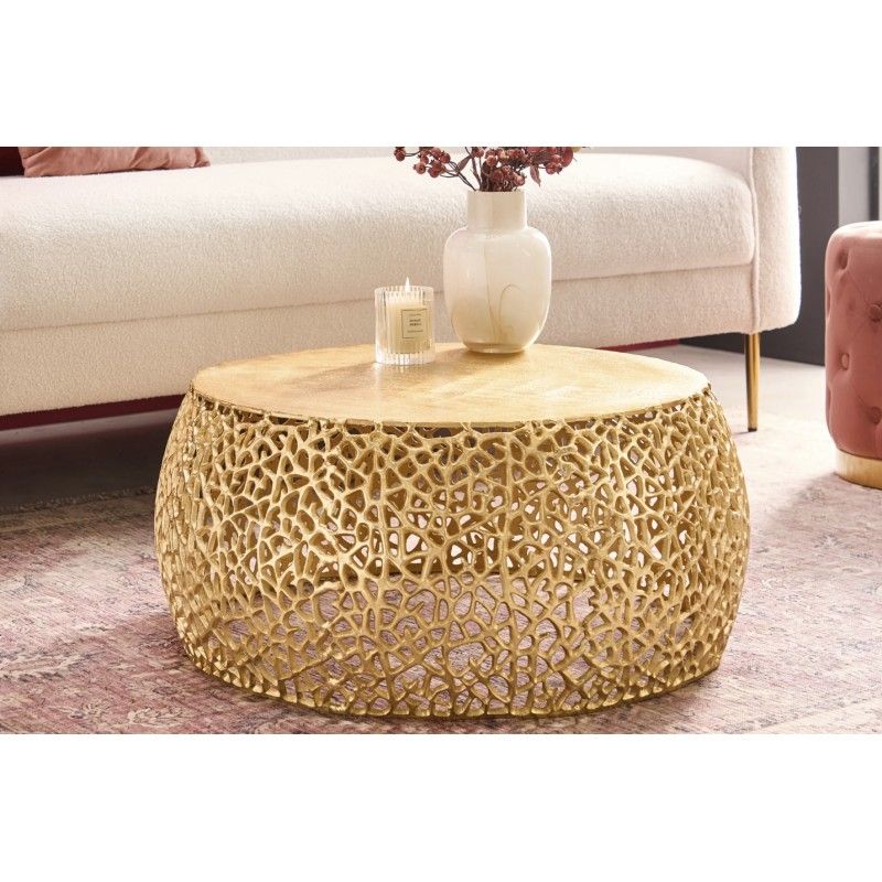 Sa structure ajourée aux motifs géométriques apporte un rythme visuel structuré et une identité décorative forte. Le plateau circulaire effet bois, d’un diamètre de 62 cm, adoucit l’ensemble et offre une surface fonctionnelle idéale pour un usage quotidien. L’association du métal doré brillant et de l’aspect bois confère à cette table basse METRIX un style à la fois design et accueillant.
