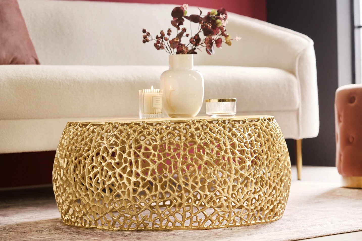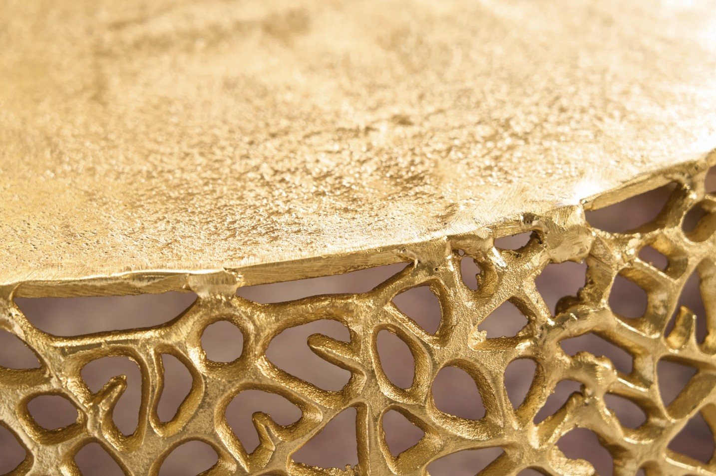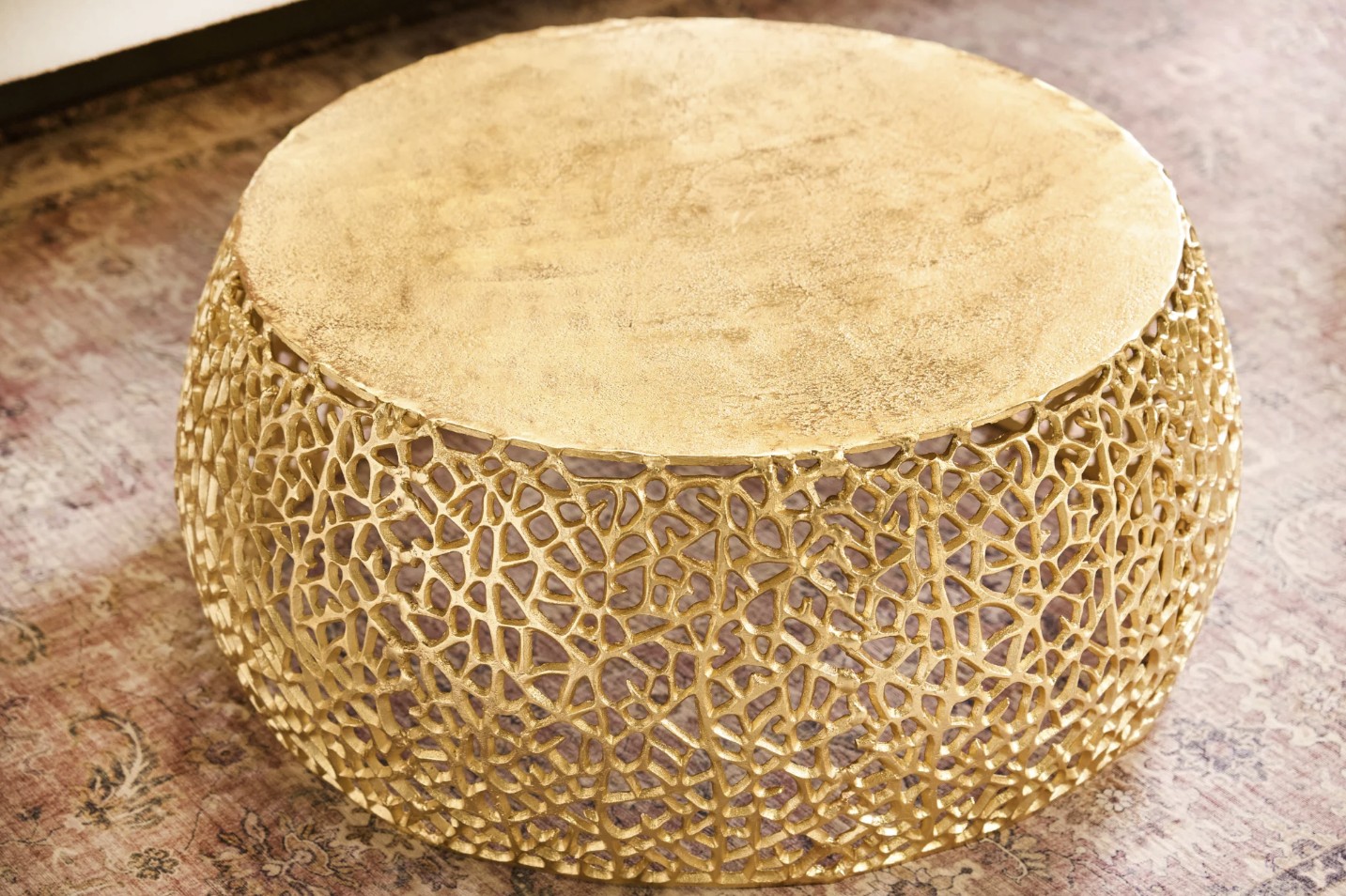 Sa structure ajourée aux motifs géométriques apporte un rythme visuel structuré et une identité décorative forte. Le plateau circulaire effet bois, d’un diamètre de 62 cm, adoucit l’ensemble et offre une surface fonctionnelle idéale pour un usage quotidien. L’association du métal doré brillant et de l’aspect bois confère à cette table basse METRIX un style à la fois design et accueillant.