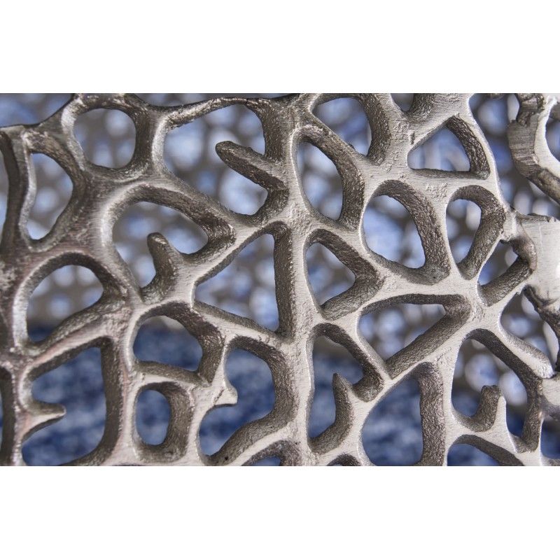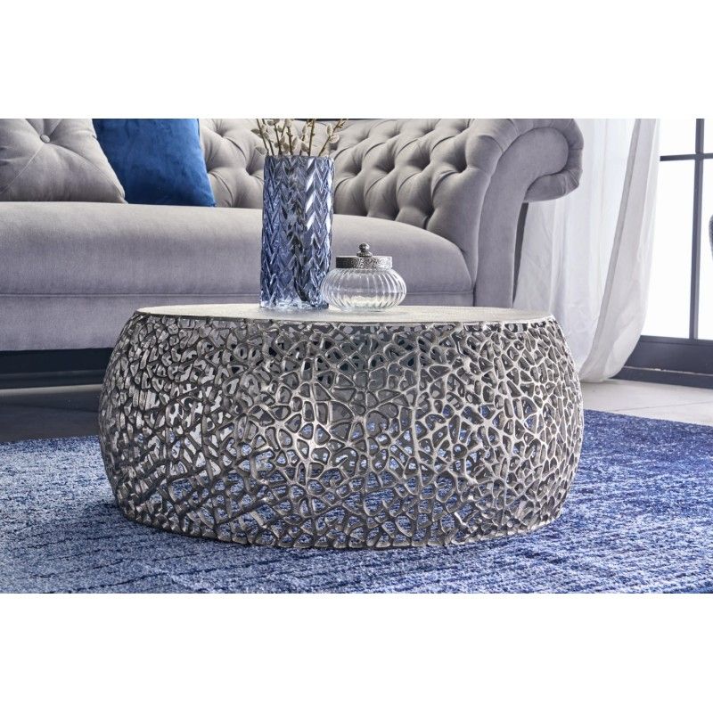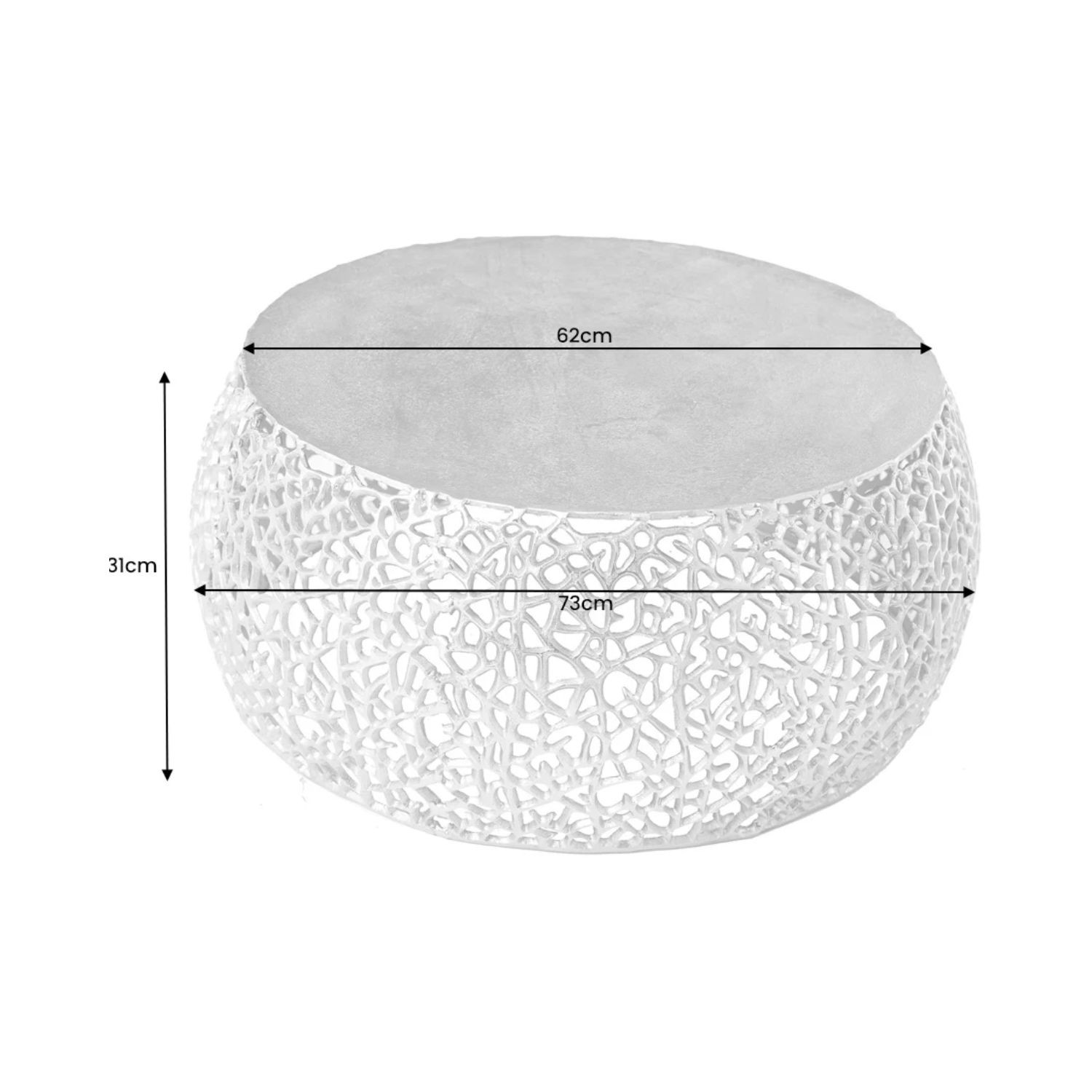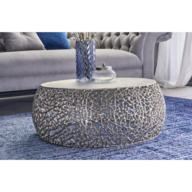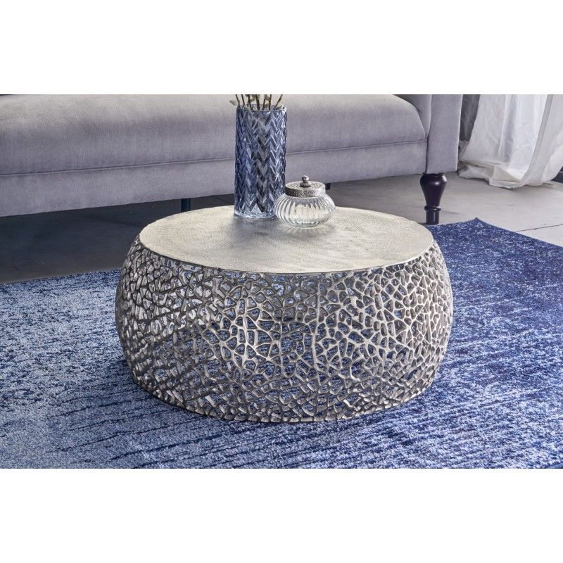 Sa structure en aluminium argenté se distingue par un motif géométrique ajouré, apportant relief et profondeur sans alourdir l’ensemble. Le plateau circulaire blanc mat, d’un diamètre de 62 cm, contraste avec la brillance du métal et renforce l’aspect graphique du modèle. Cette combinaison de textures et de finitions confère à la table basse METRIX une allure résolument contemporaine, idéale pour un intérieur moderne ou minimaliste.