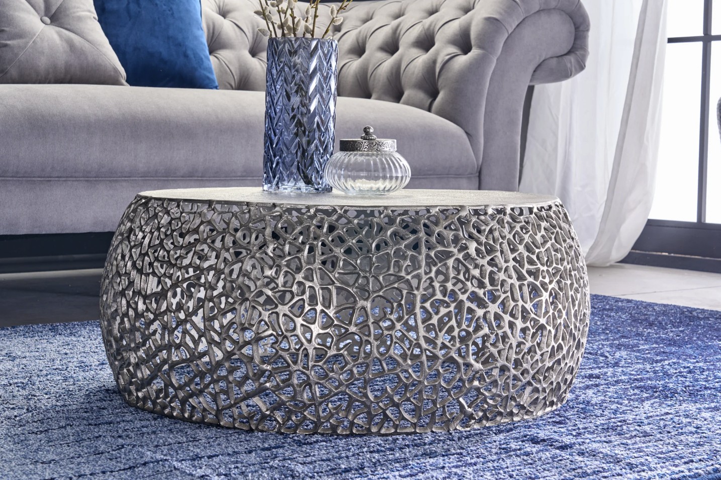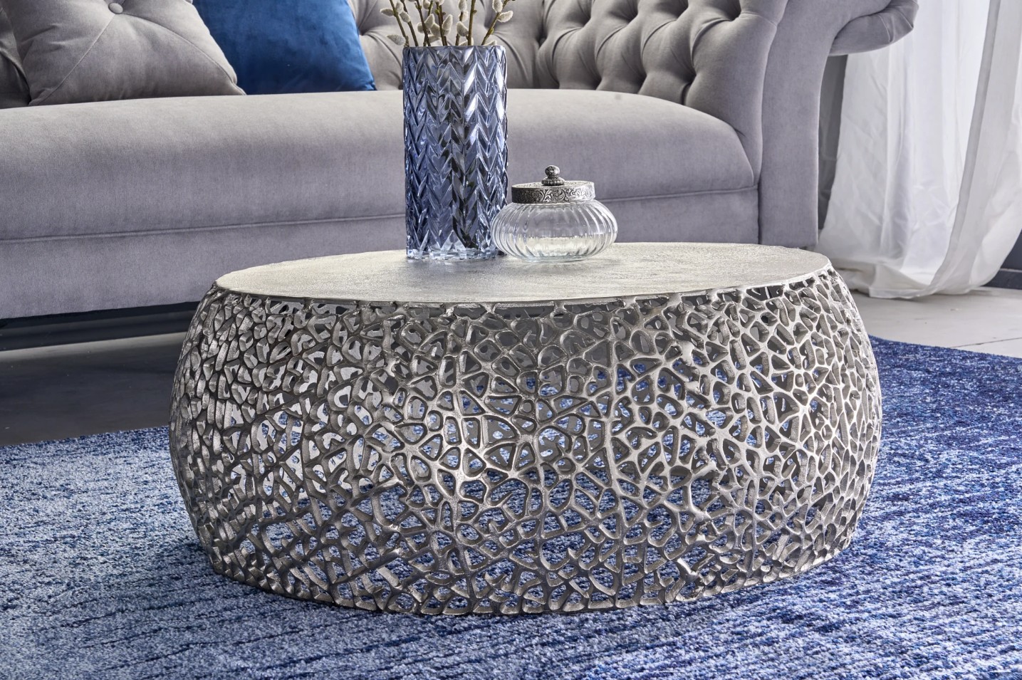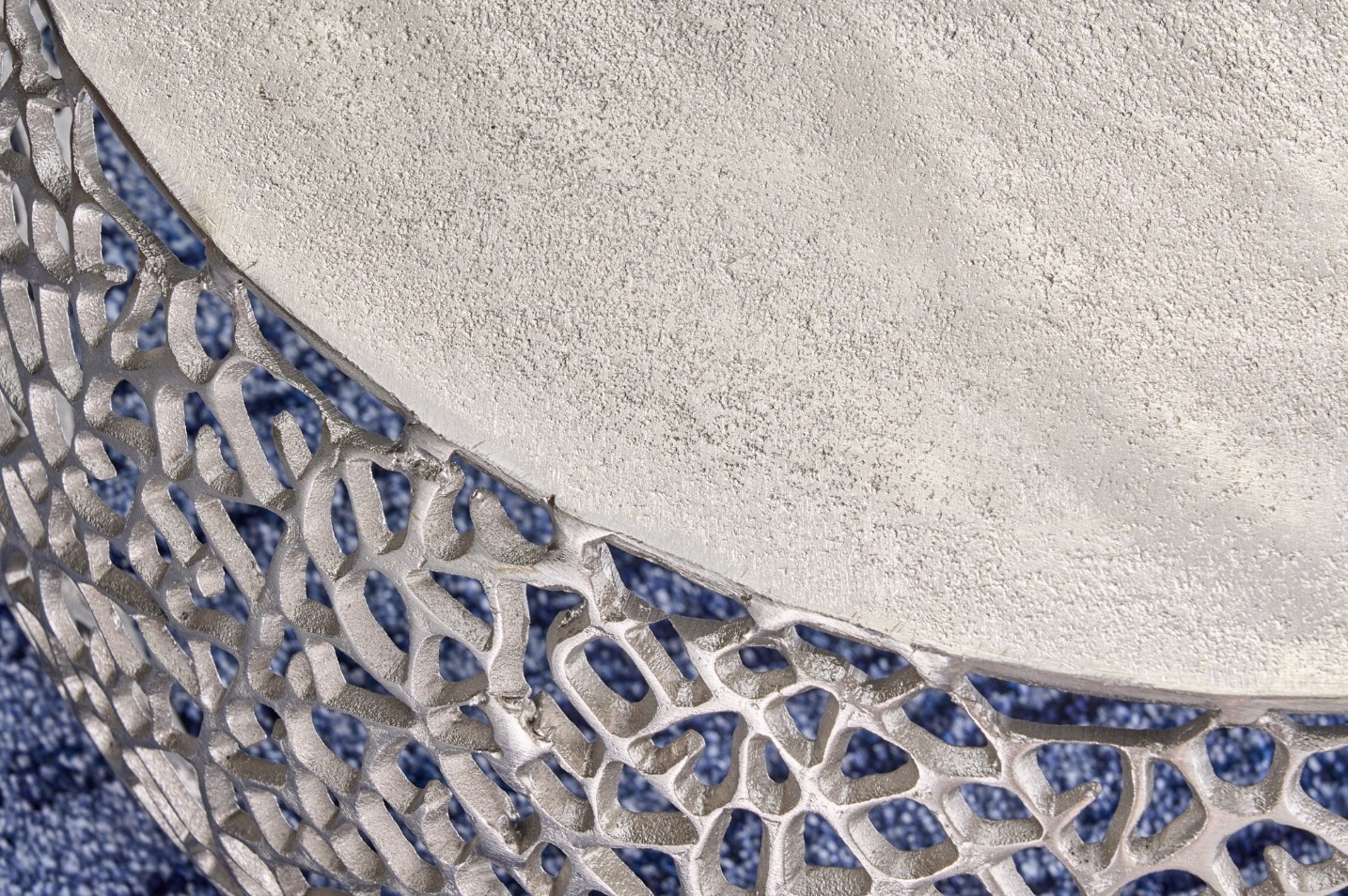 Sa structure en aluminium argenté se distingue par un motif géométrique ajouré, apportant relief et profondeur sans alourdir l’ensemble. Le plateau circulaire blanc mat, d’un diamètre de 62 cm, contraste avec la brillance du métal et renforce l’aspect graphique du modèle. Cette combinaison de textures et de finitions confère à la table basse METRIX une allure résolument contemporaine, idéale pour un intérieur moderne ou minimaliste.