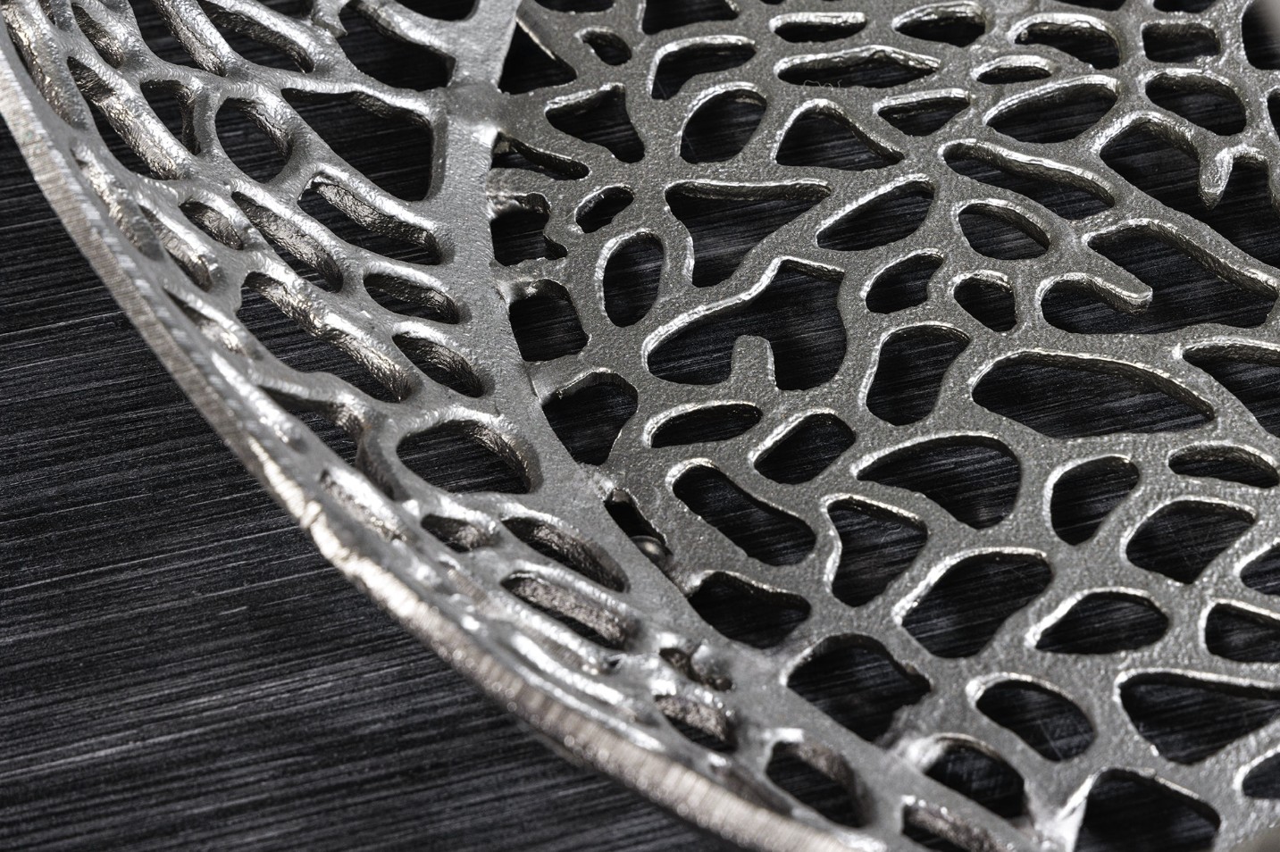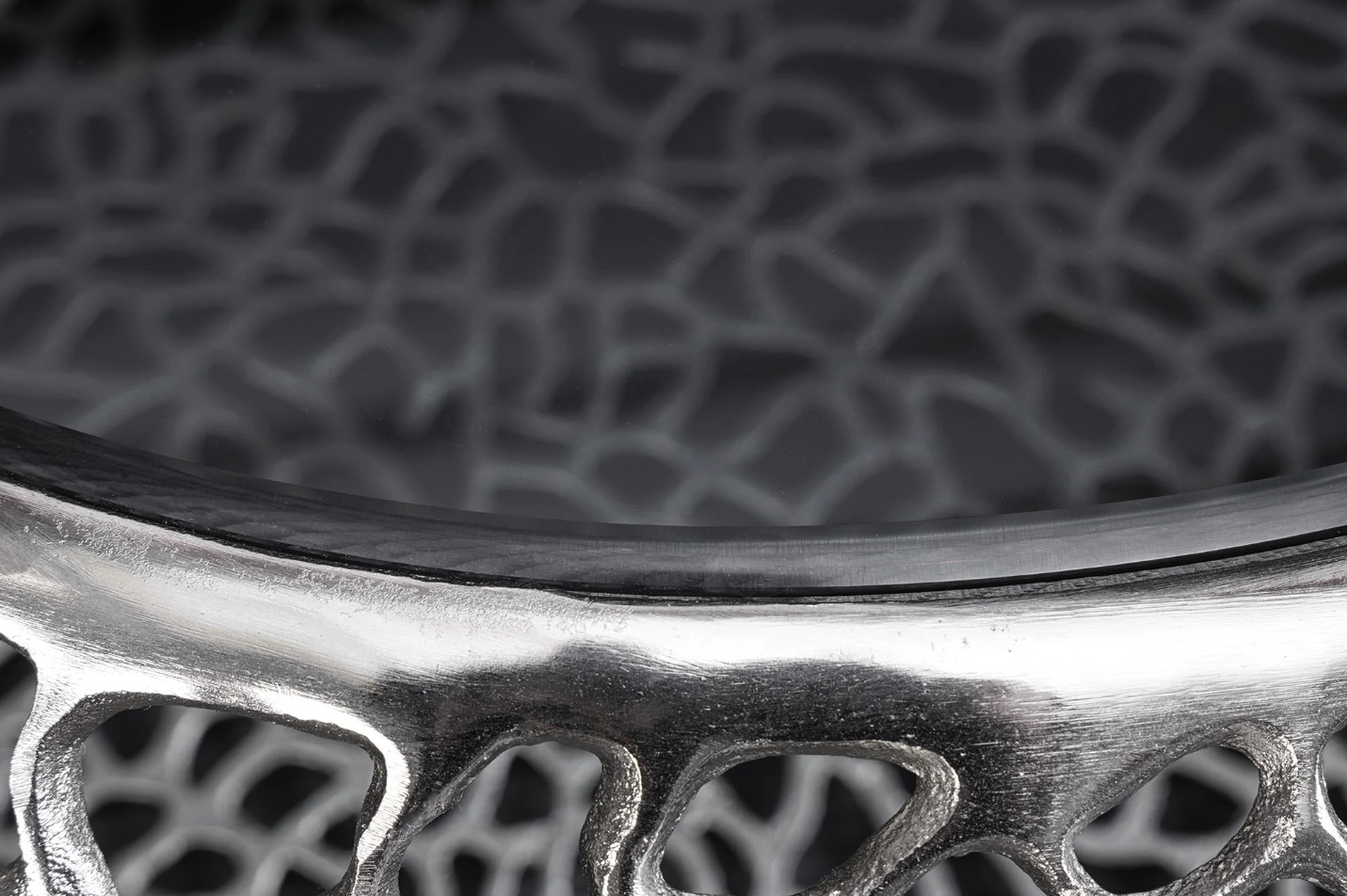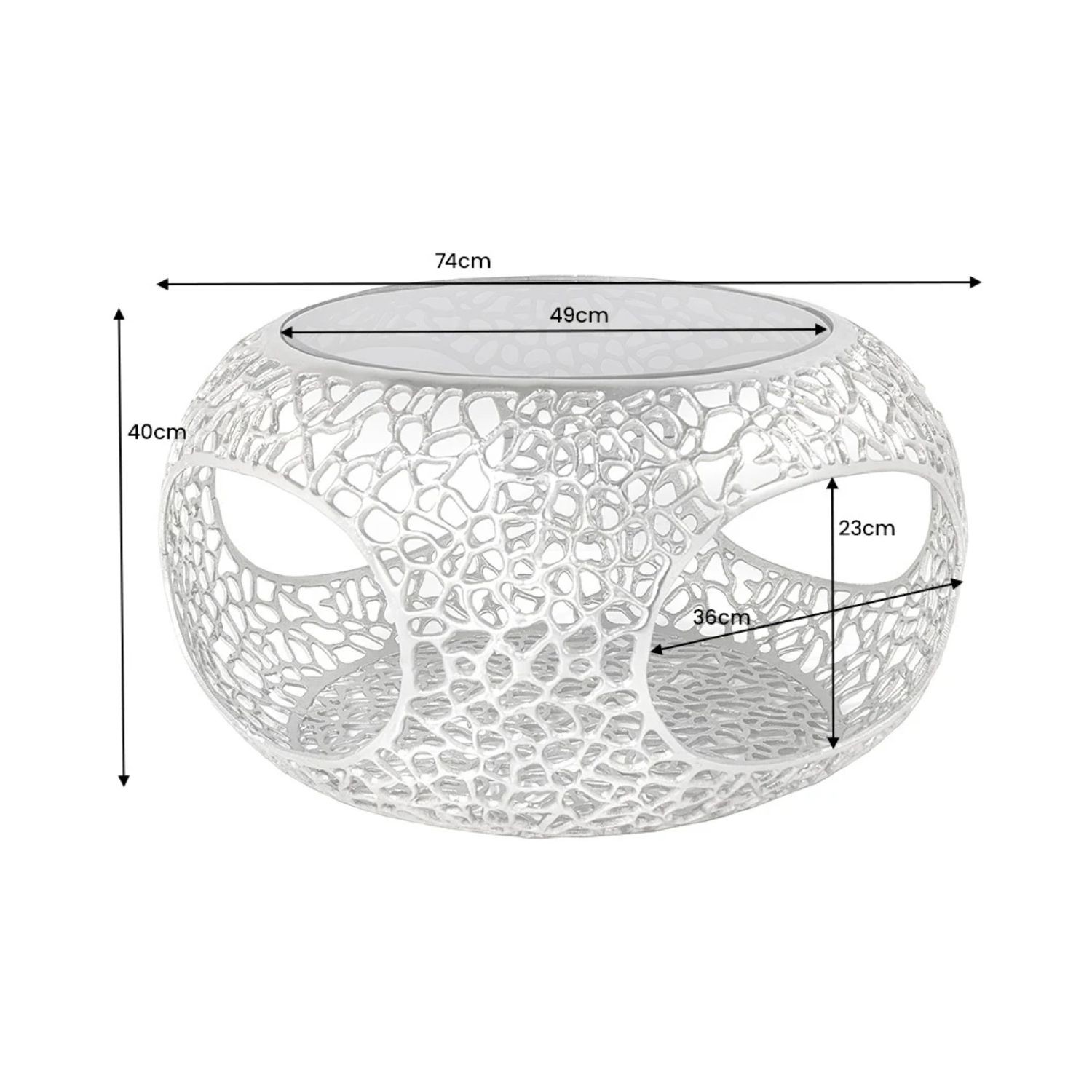 Dotée d’un plateau en verre trempé noir d’une épaisseur de 5 mm, cette table basse garantit résistance et facilité d’entretien. Sous le plateau, une niche visible et ouverte sur chaque face (avant, arrière, droite et gauche) permet de garder livres, magazines ou objets décoratifs à portée de main. Le motif géométrique arrondi ajouré structure l’ensemble et apporte une signature graphique élégante à la collection METRIX.