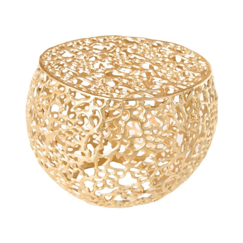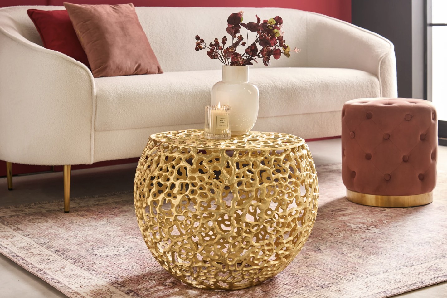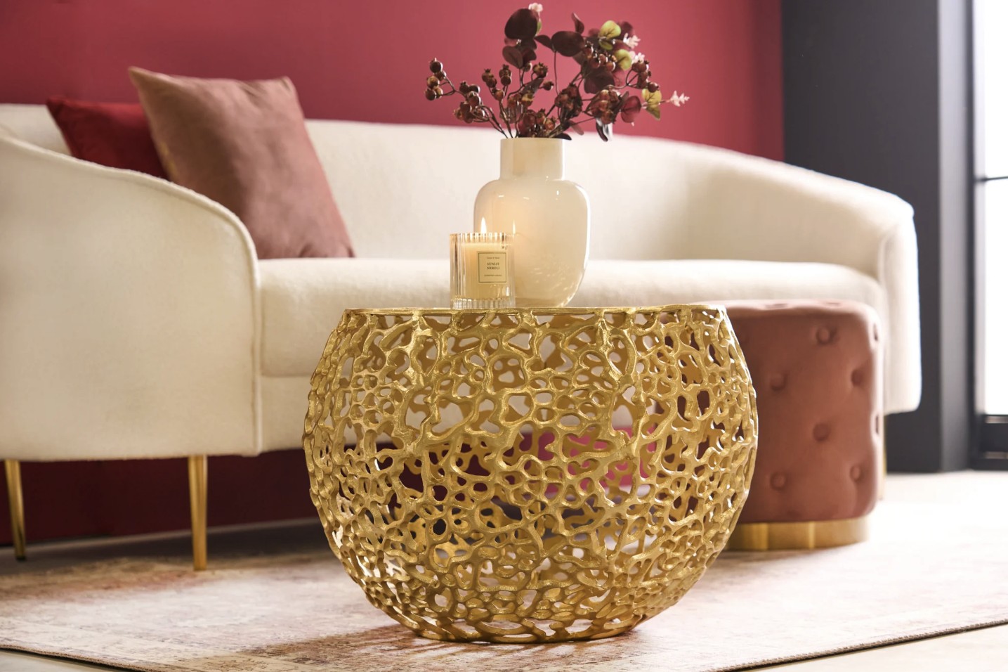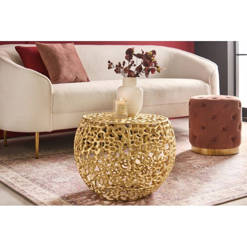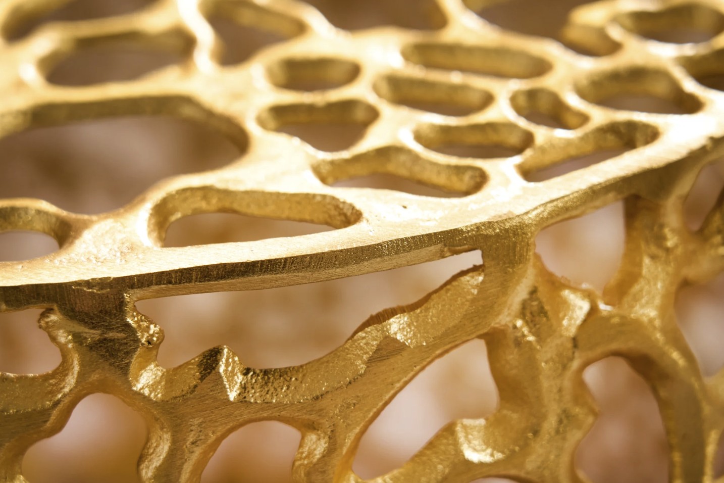 La table basse METRIX de 53 cm séduit par son format compact et son esthétique contemporaine inspirée des formes naturelles. Sa structure en aluminium doré brillant apporte une touche lumineuse au salon, tandis que son motif ajouré crée un jeu de volumes subtil, idéal pour les espaces modernes.