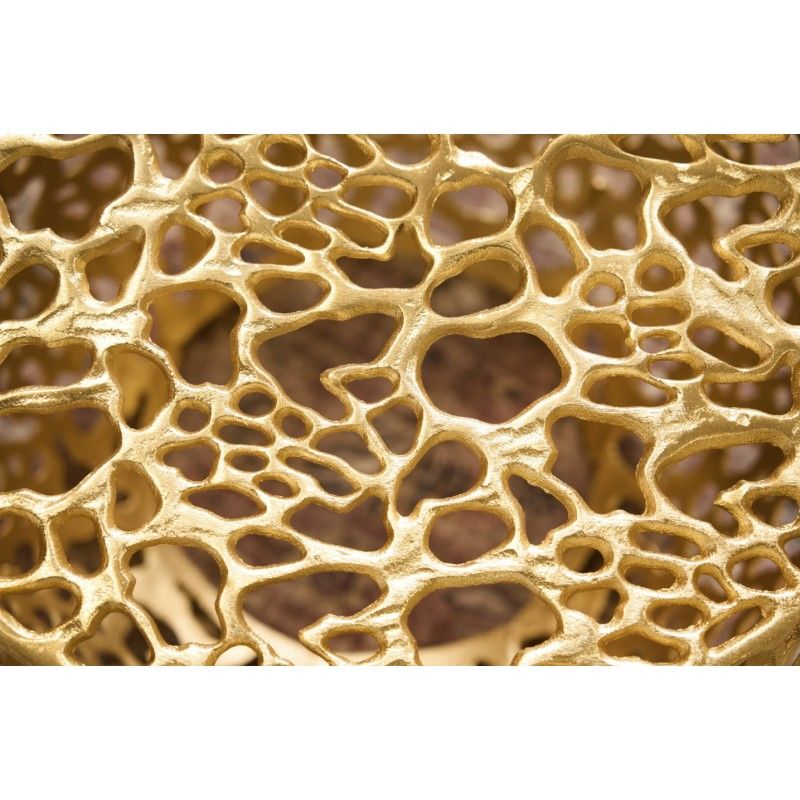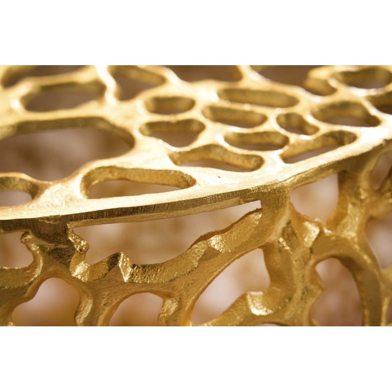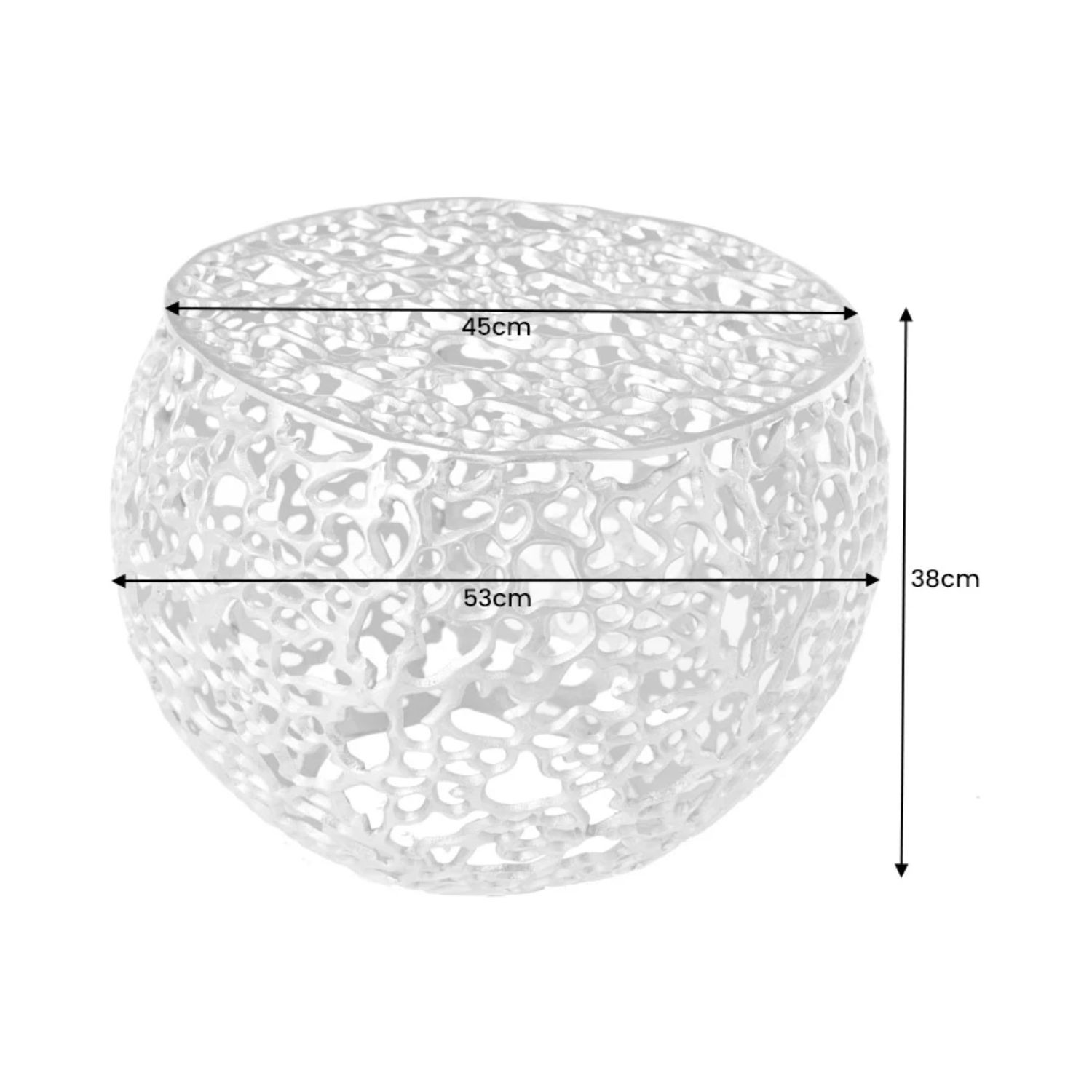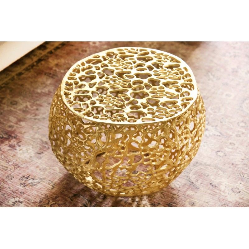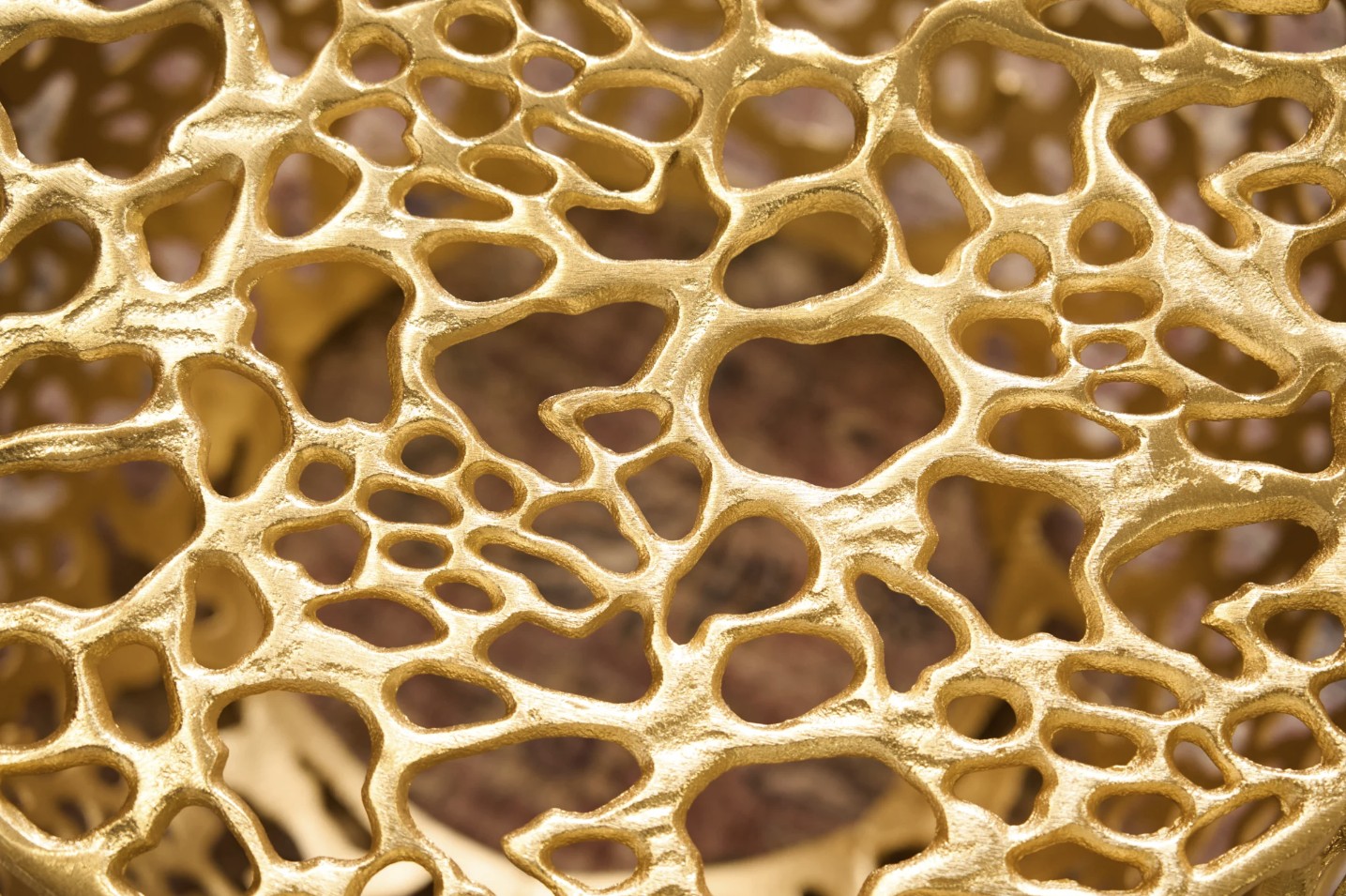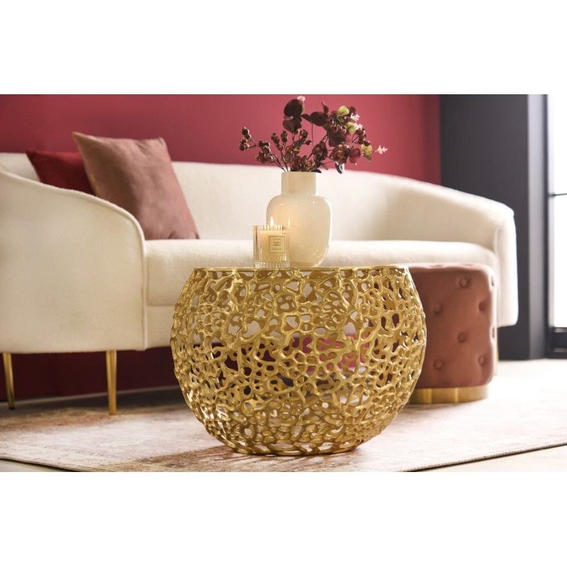 La table basse METRIX de 53 cm séduit par son format compact et son esthétique contemporaine inspirée des formes naturelles. Sa structure en aluminium doré brillant apporte une touche lumineuse au salon, tandis que son motif ajouré crée un jeu de volumes subtil, idéal pour les espaces modernes.