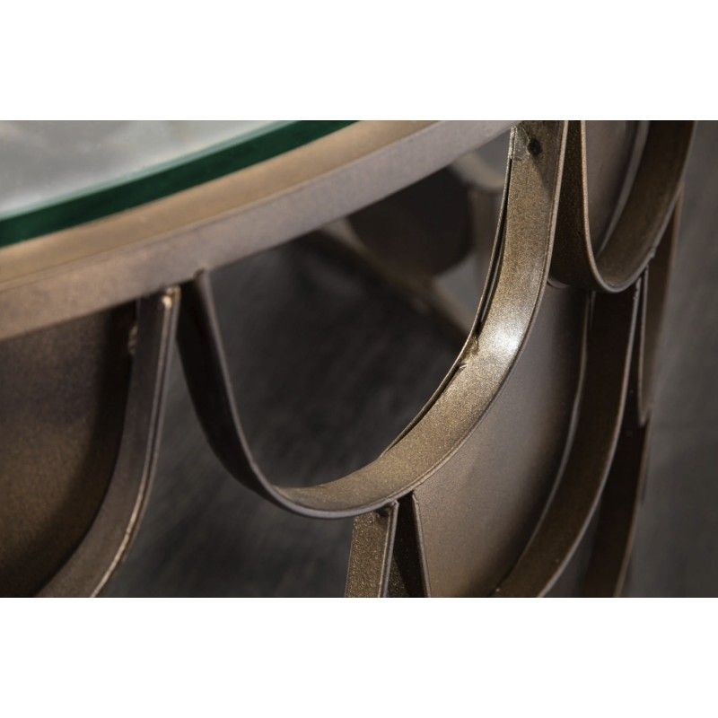 La table basse METRIX ronde de 60 cm se distingue par une esthétique sculpturale et une forte identité décorative. Sa structure en métal finition bronze foncé attire le regard grâce à un motif travaillé, tandis que son plateau en verre trempé apporte légèreté et transparence à l’ensemble. Une pièce pensée pour sublimer un salon contemporain.