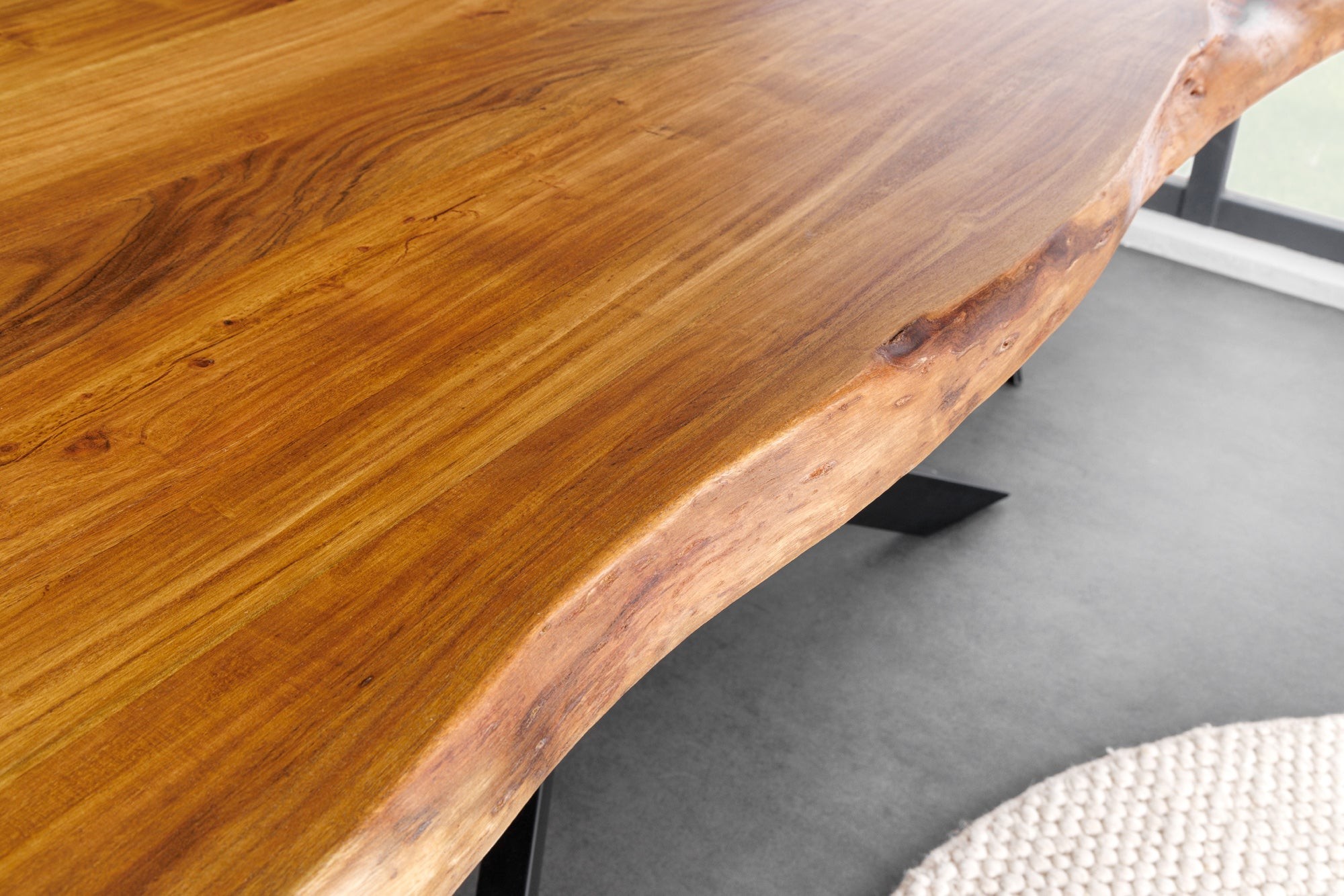 Le plateau de la table ARKAYA, réalisé en bois massif d’acacia d’une épaisseur de 35 mm, met en valeur la richesse des veines naturelles et la chaleur du bois. Sa finition vernie apporte une subtile brillance tout en protégeant la surface. Les bords naturels, volontairement irréguliers, renforcent l’authenticité du meuble en rappelant la forme originelle du tronc d’arbre. La structure en métal noir, sobre et angulaire, crée un contraste harmonieux entre la chaleur du bois et la modernité du métal.