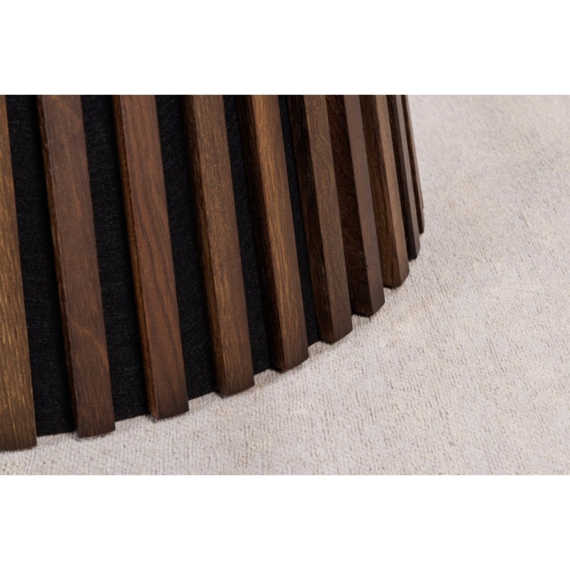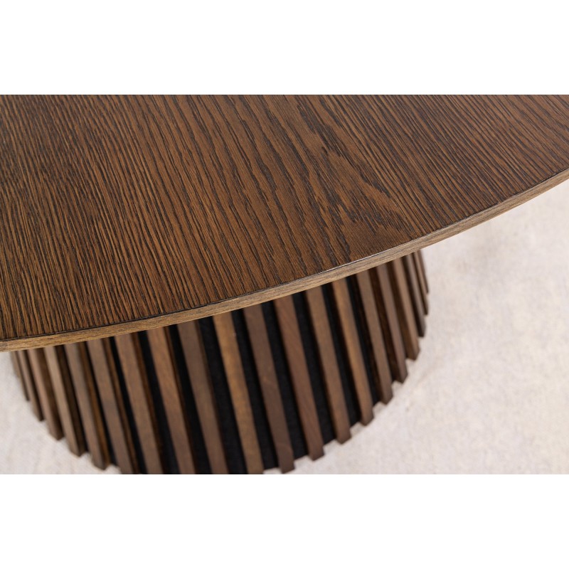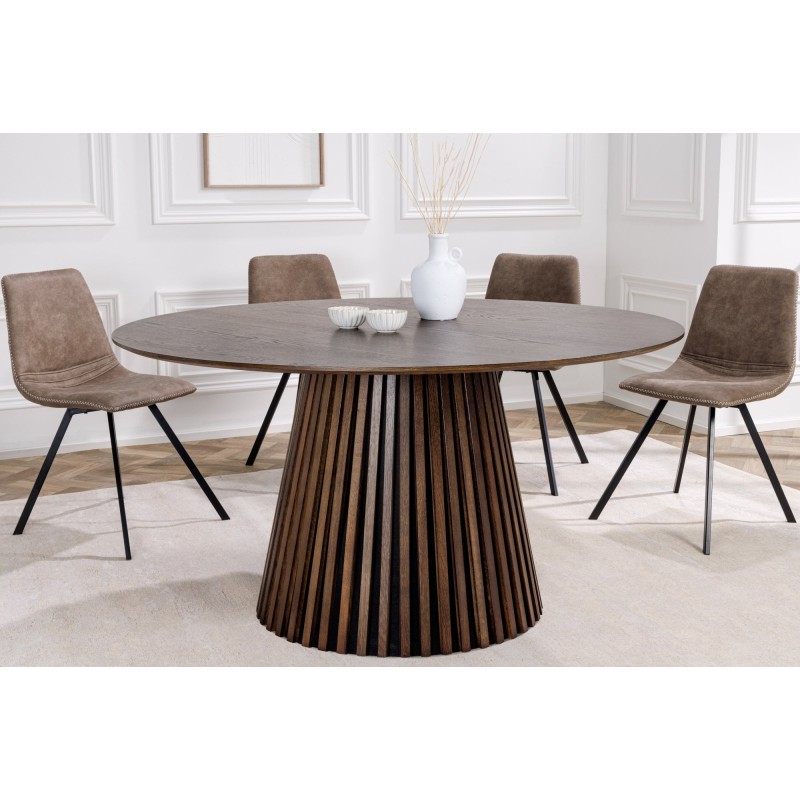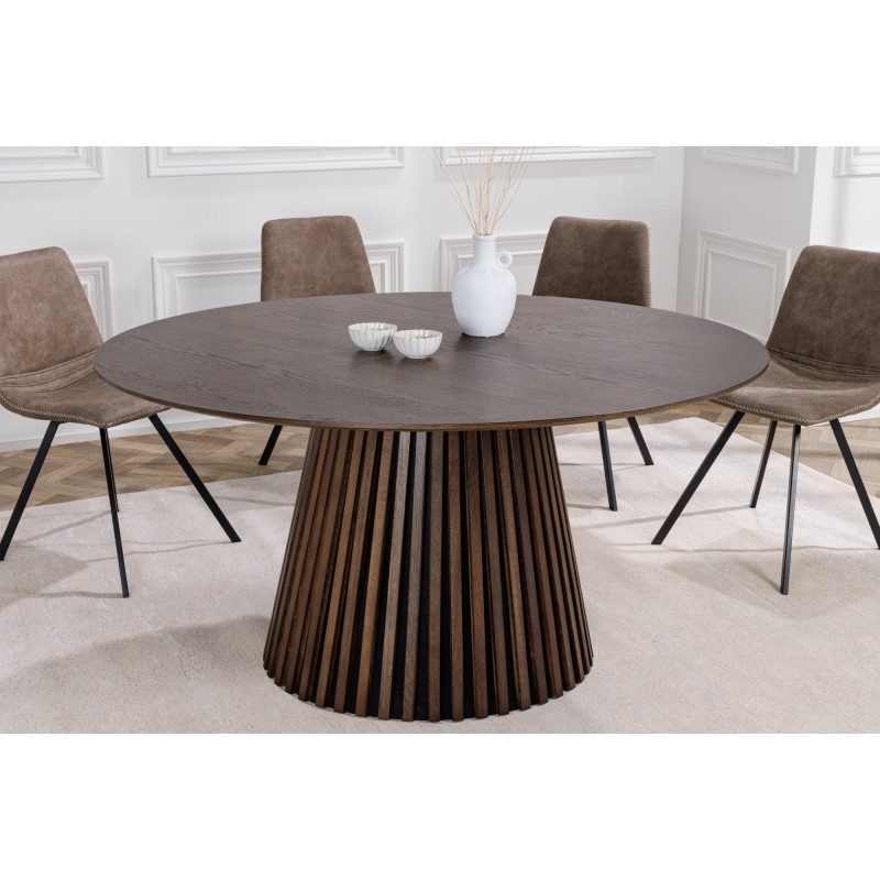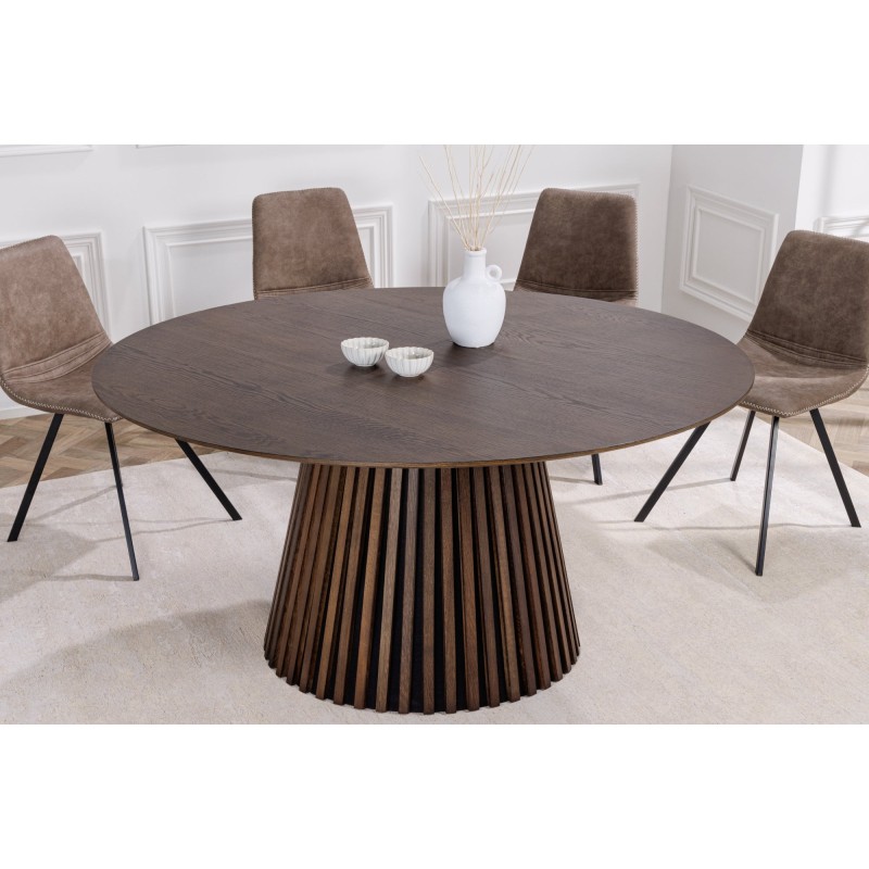 Conçue en MDF et placage chêne de haute qualité, la table KANOVA séduit par sa finesse d’exécution et sa finition effet bois foncé qui souligne toute la richesse du matériau. Son plateau de 18 mm d’épaisseur repose sur un pied central stable, garantissant confort et praticité lors des repas. Facile d’entretien et robuste, elle combine esthétique et durabilité au quotidien.