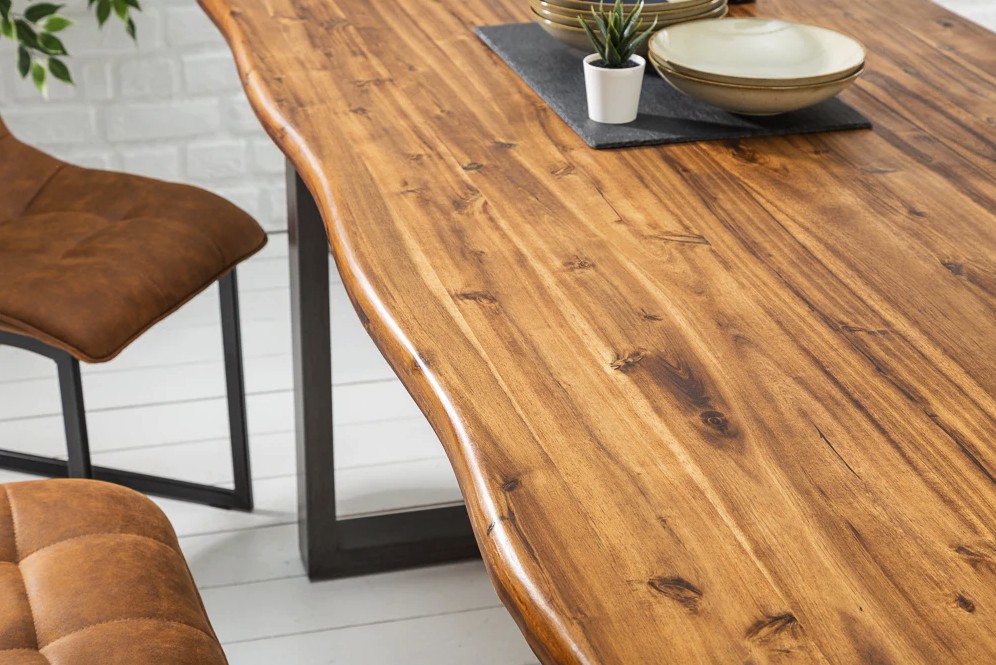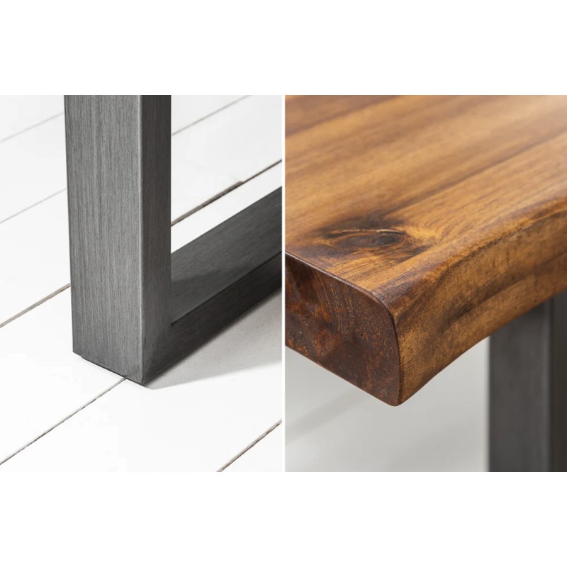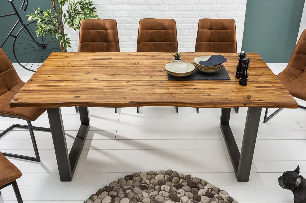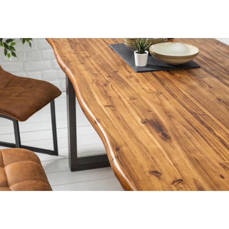 La table de salle à manger NALKO séduit par son design industriel puissant, porté par un superbe plateau en bois massif d’acacia brun huilé et des pieds en métal noir en forme de U. Son bord irrégulier lui confère un charme brut et une élégance naturelle, idéale pour créer un espace chaleureux et contemporain.