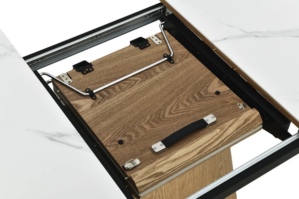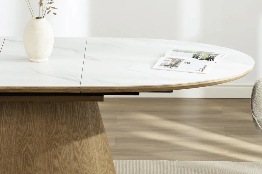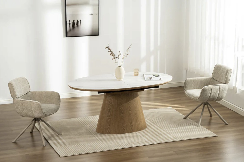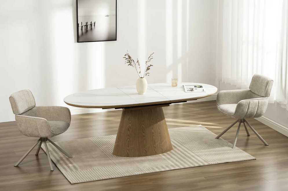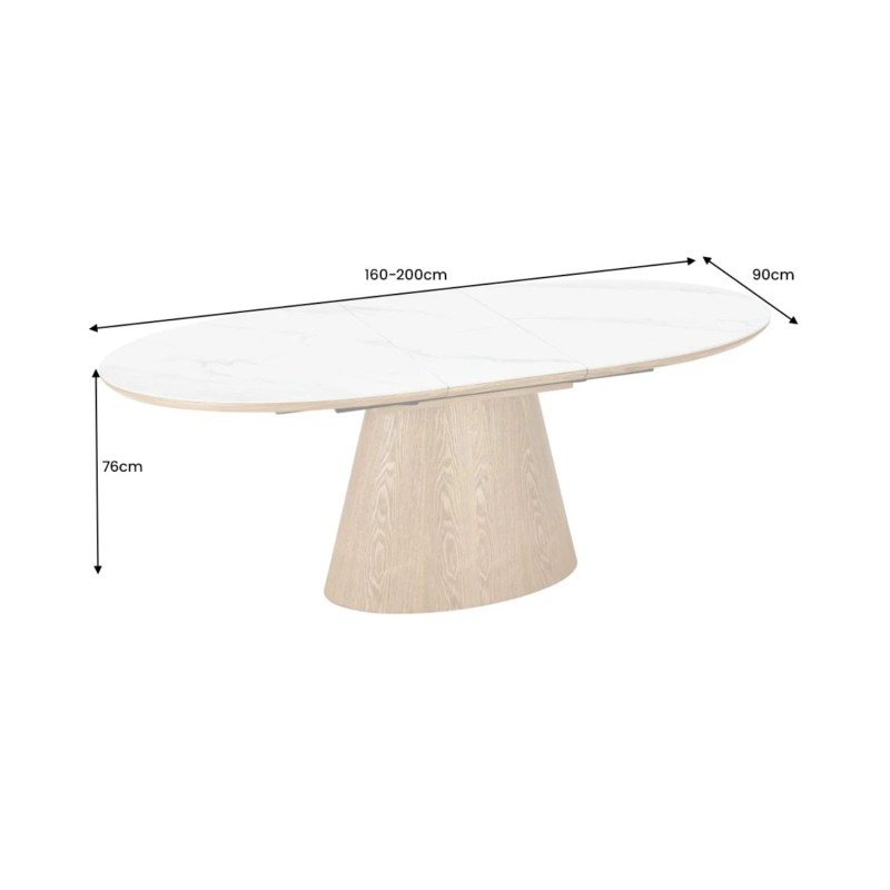 La table de salle à manger LUMEA allie le raffinement d’un plateau en céramique effet marbre blanc à une structure robuste en bois plaqué chêne. Son design ovale et contemporain en fait une pièce forte, idéale pour apporter luminosité et modernité à votre salle à manger. Grâce à son système d’extension intégré, elle passe aisément de 160 à 200 cm, vous permettant d’accueillir plus de convives en un instant.