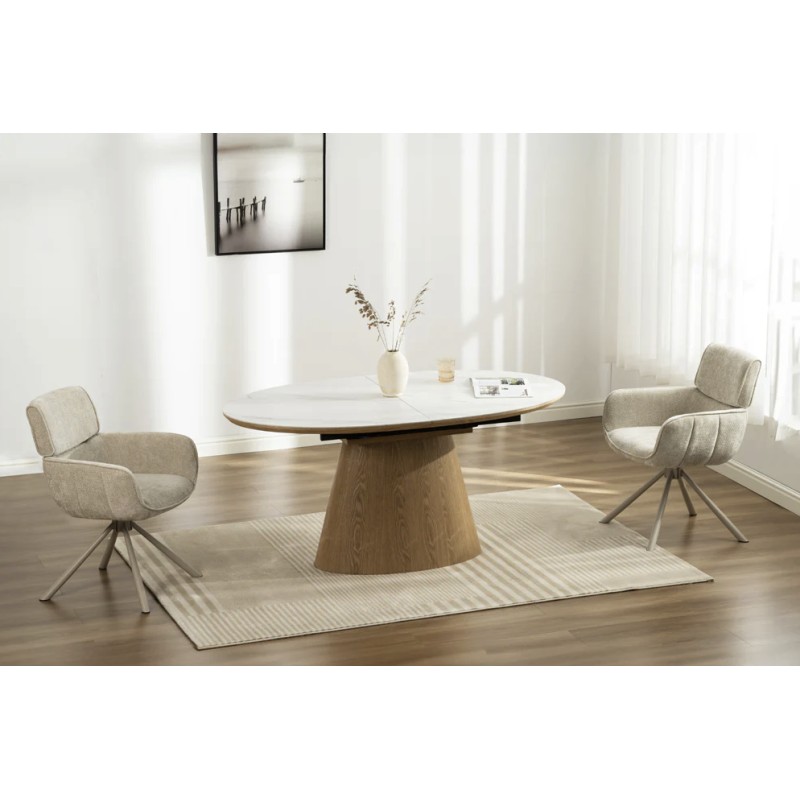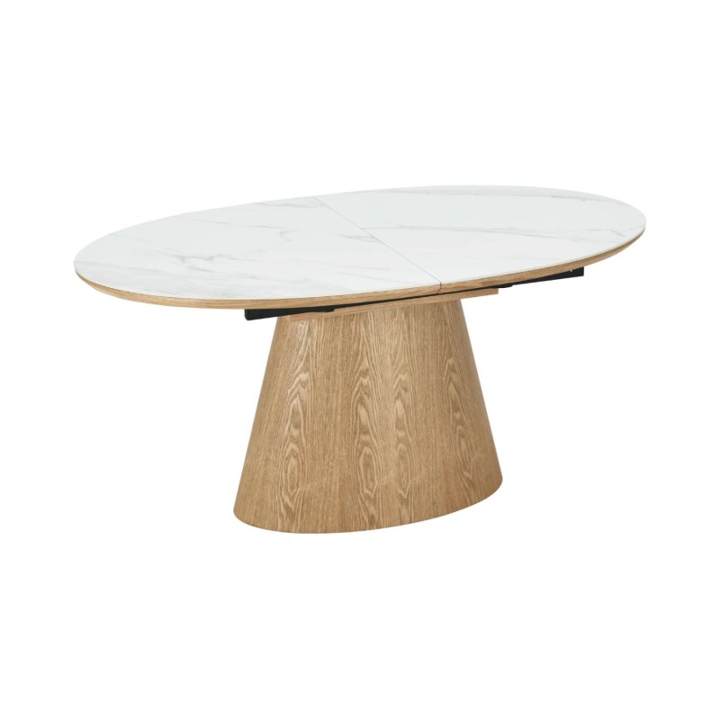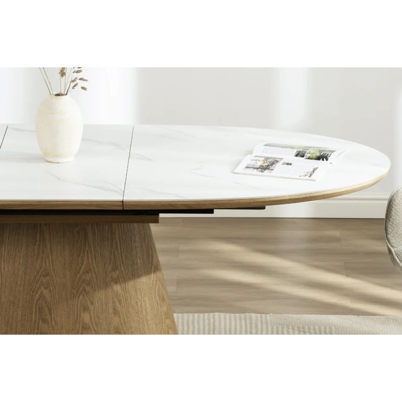 Le plateau en céramique offre une excellente résistance aux rayures, à la chaleur et aux taches, tout en offrant un aspect marbre blanc très tendance. La structure en bois plaqué chêne assure stabilité et esthétique naturelle. Avec sa capacité de charge de 100 kg et sa forme ovale harmonieuse, la table LUMEA devient rapidement un élément central de votre décoration intérieure.